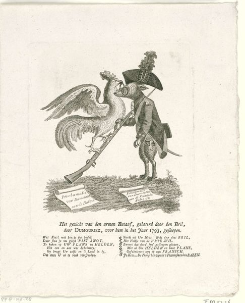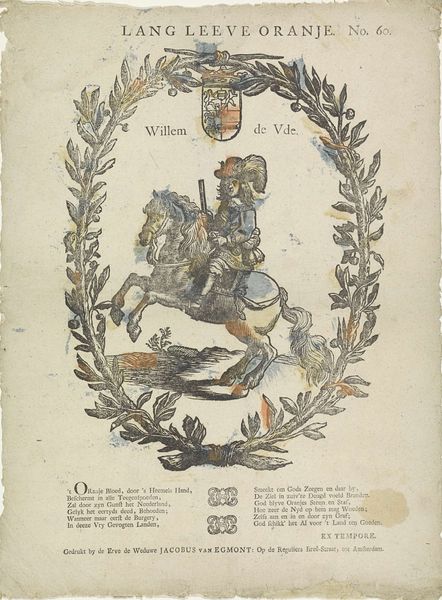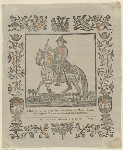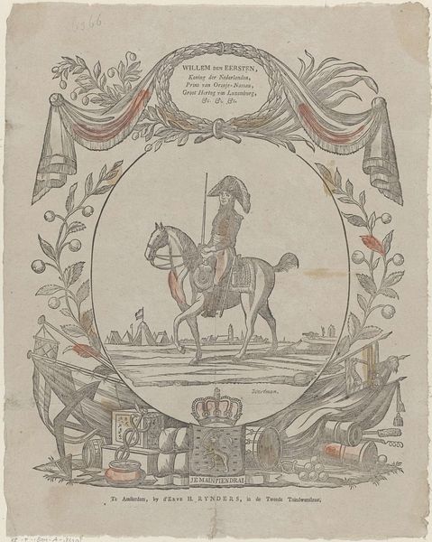 Curator: This is "Willem den eersten," an engraving of King William I of the Netherlands, dating from 1831 to 1854. Made with ink, it shows the king on horseback in a decorative frame. Editor: The details are amazing. I noticed that the scene almost looks like a stage, with all the symbolic objects placed very deliberately around the portrait. I'm wondering what this composition suggests about how the king wished to be viewed by the public? Curator: Good question. Consider the socio-political context. William I ruled during a turbulent period, emerging after the Napoleonic wars. This image is not just a portrait; it's a carefully constructed piece of political communication. The crown, the weaponry, even the inscription “Je Maintiendrai”—French for "I will maintain"—what do those details tell us? Editor: It does feel like he's making a statement about power and stability. But why depict himself on horseback, framed by military equipment and national symbols? Curator: Equestrian portraits have long been used to convey leadership and military strength. Placing the king against a backdrop of tents implies his presence on the battlefield. And don't miss the cityscape – likely The Hague – a symbol of governance and order he intends to protect. This image serves as both a display of power and an assertion of his divine right to rule, doesn't it? The "divine right" aspect is probably being alluded to subtly, as such concepts were out of style in the 19th Century. Editor: Ah, I see. So, the artist uses established symbols to craft an image that reinforces the king's authority and the idea of national strength. Did people question this carefully crafted public image at the time? Curator: Absolutely. The Dutch public had complex opinions about William I's reign, with increasing dissatisfaction over his autocratic tendencies and economic policies. Consider how the rising bourgeois press challenged the government. Images like these become focal points for debating and solidifying views. Editor: That makes perfect sense. Thank you. It's fascinating to think about how much political messaging could be packed into what looks like a simple portrait. Curator: Indeed. By examining the historical context and decoding visual cues, we gain a richer appreciation for art’s role in shaping perceptions and power.