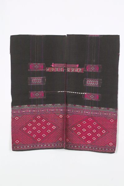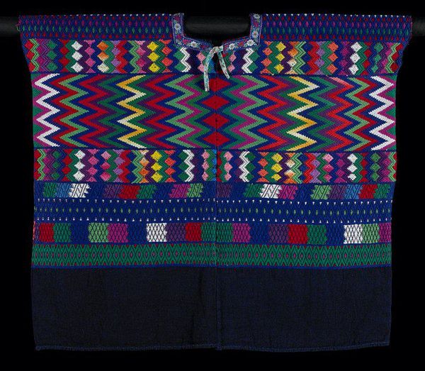 Curator: Here we have a Ceremonial blouse, or Huipil, likely woven sometime between 1930 and 1940. It's currently part of the collection here at the Minneapolis Institute of Art and is a remarkable example of textile work. Editor: My first impression is how strikingly it’s divided. The upper section explodes with vibrant purples and intricate patterning, while the lower portion presents a serene expanse of white. The contrast is quite powerful. Curator: Indeed. From a formal perspective, note the precision of the geometric forms. The diamonds, chevrons, and meticulously aligned dots are not merely decorative. Observe how they create rhythm and visual hierarchy. Editor: To me, the motifs read as more than just patterns. Consider the lozenges, for example, echoing perhaps the cycle of life or celestial symbols. The Huipil served more than just a functional role, but likely conveyed profound cultural or spiritual meanings. Curator: Undoubtedly, yet the tension between the constructed geometry and potential symbolism makes for compelling viewing. We must also attend to the piece’s materiality – the blend of cotton, silk, and potentially other fibers create subtle textural shifts. How the light catches each woven segment matters, I suggest. Editor: Absolutely. And thinking anthropologically, these textiles record and transmit communal knowledge. We must ask: What specific myths or origin stories do these forms narrate? Who was the likely wearer, and what position did she hold within her community? Curator: Of course, understanding that history illuminates the context within which we may observe this artifact as art. We can't separate form from function. Editor: It also makes me consider how the visual vocabulary speaks to broader aesthetic traditions. Perhaps the geometric rigor links back to ancient Mayan glyphs or cosmological diagrams. It begs the question, are there contemporary iterations of this visual language in Indigenous art today? Curator: I find that question somewhat irrelevant, to be honest. It seems a somewhat spurious exercise to suggest continuity that may, or may not exist. As it is, however, the structural integrity remains compelling on its own terms. Editor: A valid point, but to truly appreciate this work, for me at least, we need to appreciate it on both of these terms. Curator: Perhaps so. I appreciate that tension between the formal construction and iconographic analysis—it yields unexpected dimensions to a seemingly simple textile.