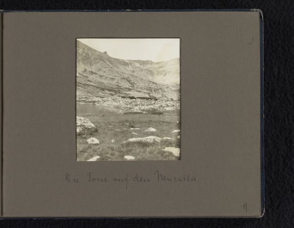 Editor: This is a page from an album, “Trektocht in de Oostenrijkse Alpen,” or Hiking Tour in the Austrian Alps, by Berti Hoppe, sometime between 1930 and 1938. These are albumen prints documenting different points in the landscape, with hand-written captions in German. I’m immediately struck by how these seemingly simple, candid shots capture the grandeur of the Alps, yet there’s also this very deliberate composition. How would you interpret this work? Curator: Certainly, let us consider the formal properties present within this arrangement. We have a series of distinct, individual photographs contained within the larger frame of the album page, forming a meta-composition. The artist guides the viewer’s eye via juxtapositions of light and shadow, achieved through monochrome photographic printing. Each photo presents its own perspective. Does that sequencing elicit a sense of progression in your view? Editor: I think so! It does suggest a journey unfolding across the page, like following a trail upwards through different terrains and views. I notice in all these shots, the human presence is relatively diminutive within such a powerful natural landscape, even when hikers appear in some of the frames. Curator: Precisely. Note how Hoppe balances geometric precision with organic textures to explore the relationship between the individual and nature. Consider, as well, the flatness intrinsic to the photographic image; even as perspective is offered through landscape, these are flattened planes. What effect might that flattening have? Editor: It perhaps emphasizes the documentarian quality, rather than being overly sentimental about the view. It makes it feel grounded. The album itself becomes almost like a topographical map, charting not just locations, but moments in time. Curator: I concur, the work uses photographic formal components as coordinates within that system you proposed. I will remember that notion as quite revealing.