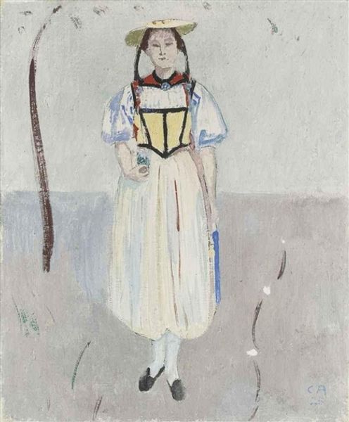 Curator: Stepping up to the canvas, we're about to consider Toulouse-Lautrec's "Émilie," thought to be painted in the late 1890s. Lautrec employs oil paint to bring to life a snapshot of Parisian life. What catches your eye right away? Editor: The immediate sense is of fleeting transience, almost as if this moment is dissolving before our eyes. There’s a starkness to the palette—muted greens, creams, and blues—which speaks to a deeper story, beyond just a stroll in the park. Curator: Indeed. Toulouse-Lautrec had a keen eye for social dynamics. It's intriguing how he captures a seemingly casual genre painting scene yet manages to infuse it with an element of psychological depth. This flâneur's existence. The main subject, Émilie, is presented with such incredible style and an almost ethereal look to her posture. I cannot help but consider that maybe she looks resigned. Editor: Precisely! Her turned back directs our gaze away from her face. Consider that her hat with dark plumage hints at societal roles and hidden aspects. Meanwhile, the figure on horseback fades, creating an intriguing tension between visibility and erasure. It begs us to ask what exactly is disappearing? Status? Tradition? Curator: He had that skill. Lautrec had the skill of hinting at volumes without the heavy weight of exposition. Also, I've read his relationship to Parisian society was sometimes a little waspish, right? Did he want to take down social elites? Maybe he knew her or knew about her life. The mind runs wild in this regard... Editor: Possibly, but his perspective can feel very generous towards the underdog, doesn't it? And this depiction may reflect not harsh judgement, but acceptance, reflecting on the transient and precarious beauty of modernity. Curator: Perhaps! Well, seeing this now... what remains is the strange haunting ambiguity he instilled in everyday scenes. A flâneur with questions more than answers. Editor: Yes, that’s the true iconographic punch isn’t it? This painting doesn’t simply depict a scene, it asks us to reflect on our own passing moments and fleeting impressions, and it begs us to consider what will remain of them, after us.