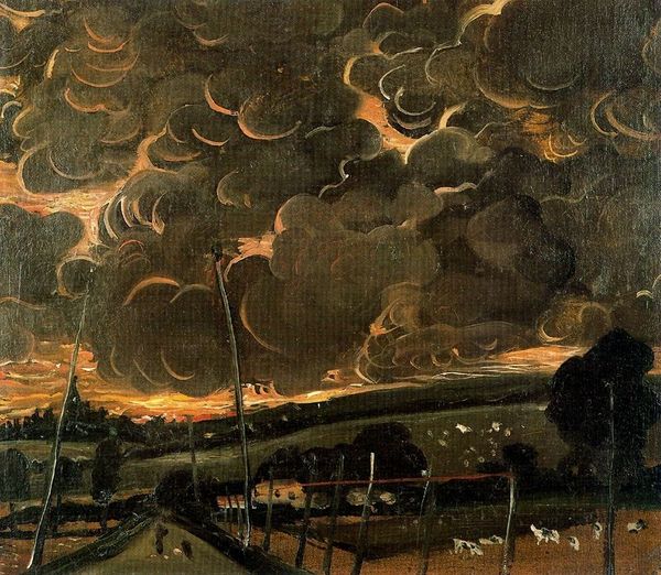 Nicholas Roerich created "Mekheski - Moon People" using paint on canvas. The colours are pretty dark, but there is such a variety of blues, greens and earth tones that it's easy to get lost in the painting process just looking at the colours. The surface of the painting seems pretty flat, which is great because it makes the colours more intense. It is a bit like looking at a tapestry or a very large and detailed illustration from a story book. The clouds in the night sky feel as solid as the buildings in the foreground. What would it be like to sit on top of one of those buildings and watch the moon? Roerich was interested in folklore, and the symbolism in this painting is similar to that in other works of his that depict landscapes with figures and mythical elements. It has the simple graphic impact of early modernist painting, like that of Edvard Munch.