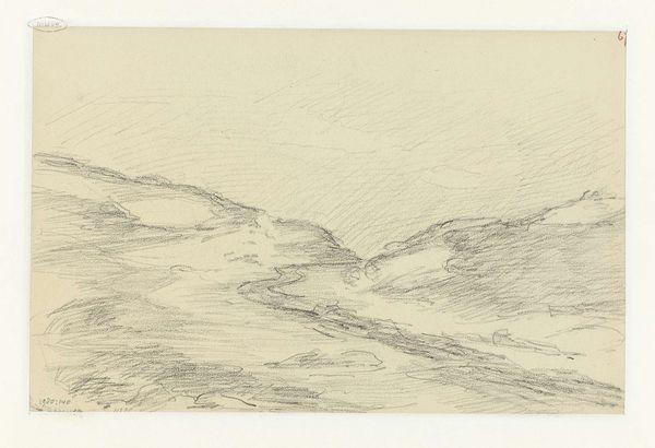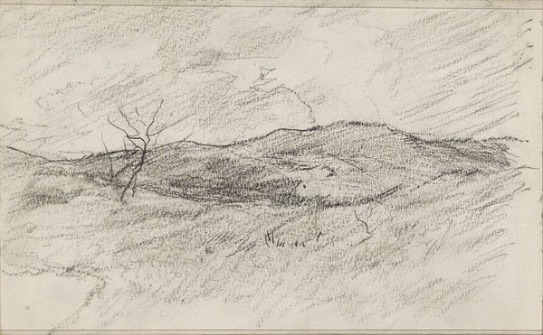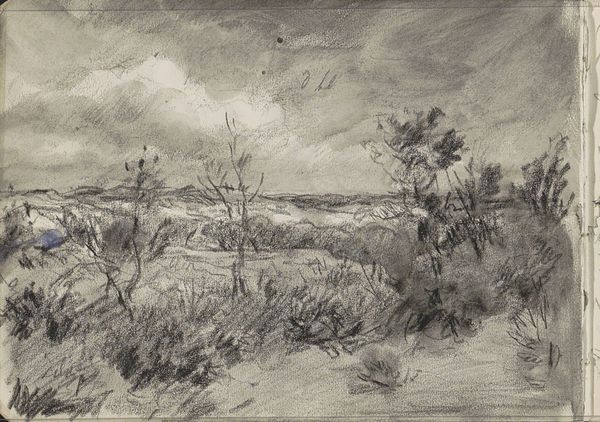 This is "Heuvellandschap," or "Hilly Landscape," a sketch made by Anton Mauve, in charcoal on paper, which now resides at the Rijksmuseum. The sketch employs a monochromatic palette, dominated by shades of gray, which creates a somber, almost melancholic mood. Mauve uses a network of hatching, cross-hatching and swift, directional strokes. This creates texture and volume across the landscape, giving the hills, clouds and path a tangible presence. The composition is structured around a low horizon line which allows the sky to dominate the upper half of the sketch, adding to the overall feeling of expanse. The path, delineated by loose lines, leads the eye into the distance, inviting the viewer to explore the landscape. The placement of skeletal trees disrupts the uniformity of the hills and acts as vertical accents, drawing attention to the atmospheric perspective. The sketch encapsulates a fleeting moment, recorded with a sense of immediacy.