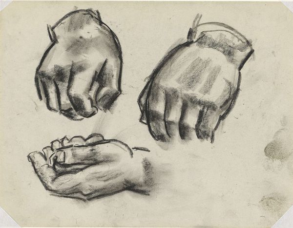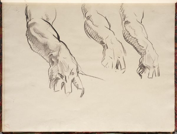 Curator: Sargent's "Two Left Hands for the Law" is a preparatory drawing for his mural series at the Boston Public Library, a study in charcoal. Editor: They're almost ghostly, aren't they? Like disembodied hands floating in a dream, caught between intention and… well, clumsiness. Curator: The title certainly suggests some kind of critique. He's exploring how justice, ideally precise, can be fumbled, rendered awkward or even harmful. Editor: I see that in the repetition, too. The doubling emphasizes the unease. Is it about the law's inability to grasp, or its propensity to mishandle? Curator: Indeed, Sargent uses the hands to symbolize the imperfect execution of legal principles. They are powerful yet somehow ineffectual. Editor: It’s a raw, revealing study, like a glimpse into the artist's own doubts about the project. Makes you reconsider the finished mural, doesn't it? Curator: Absolutely, this offers a layered interpretation of Sargent's vision. Editor: A sobering thought, as we consider "justice" at play!
