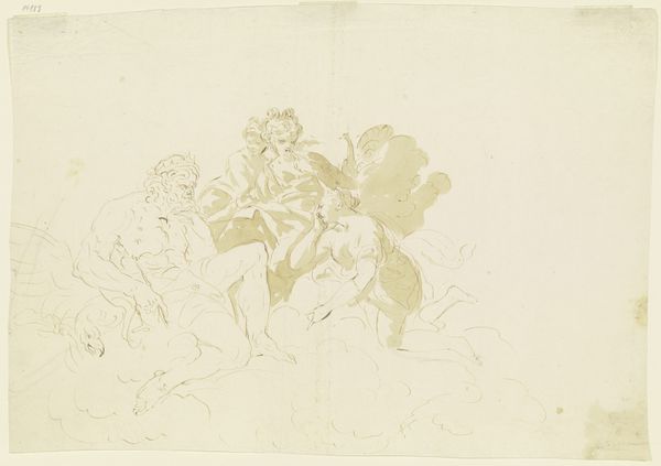 Editor: This is C.G. Kratzenstein Stub's drawing, "Brage og Idun," created between 1814 and 1816, using pencil on paper. It’s very ethereal and Romantic, but the pencil drawing seems almost unfinished. What strikes you about this work? Curator: I am drawn to the materiality of this drawing. Notice the subtle textures achievable with graphite, a material directly linked to the industrialization and resource extraction happening during the Romantic period. The landscape is but a quick gestural indication, focusing instead on the social figures, but even those are outlined with clear lines of production. Editor: So you are saying the pencil itself, and how it’s made, is important? Curator: Absolutely. Pencil wasn’t just a drawing tool; it was part of a larger system of labor and trade. The romantic portrayal is a very limited perspective on the whole artwork. Also, look at the varying pressure – it’s a means to an end. What are the implications of the drawing being on paper rather than, say, directly onto a wall as a mural? Editor: That's interesting, the ease of portability maybe? It was meant to be moved around rather than static. Did Stub's social position enable access to paper when others couldn’t obtain it? Curator: Precisely. Paper's materiality indicates access, wealth, and a certain level of literacy and privilege within 19th-century Danish society. This directly reflects the means of production during the Romantic era, linking "high art" to broader systems of production, labor, and ultimately consumption. Editor: I hadn't considered all those layers within something as simple as a pencil drawing! Now I’m really thinking about access to materials shaping artistic output. Curator: It is through material investigation that we can unravel so many historical and cultural circumstances that influenced not just this picture, but artistic practices during this era.