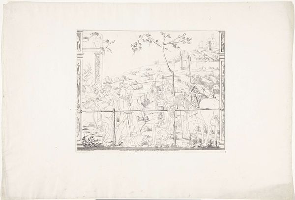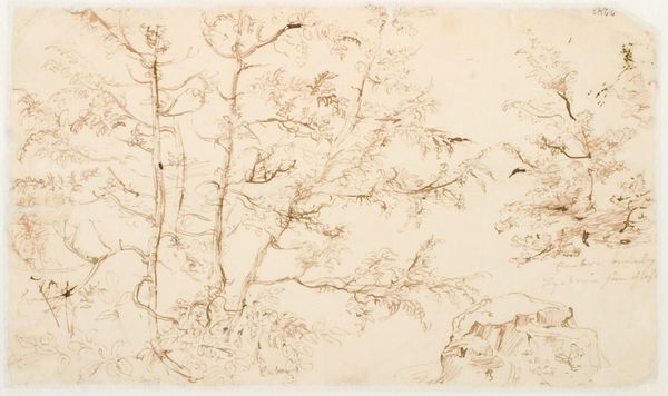 Editor: This is Turner's "AEsacus and Hesperie," an etching that captures a mythological scene. I am immediately struck by the density of the forest depicted and how difficult it is to discern the figures within. What do you see in this piece? Curator: For me, it's a glimpse into Turner's experimental mind. The dense foliage almost swallows the narrative. I wonder if he's deliberately obscuring the tragic tale, hinting at the overwhelming power of nature versus human drama? Does the lack of clarity add to the emotional weight? Editor: That's fascinating! I hadn't considered the deliberate obscurity. Curator: Or perhaps it’s an aesthetic choice, reveling in the sheer texture and play of light. It's like peering through a hazy memory. Editor: I see what you mean. It certainly invites a deeper look beyond the immediate narrative. Curator: Exactly! Turner always offers more than meets the eye.