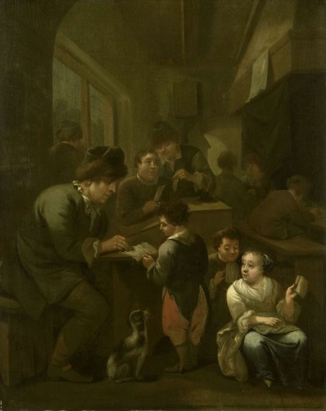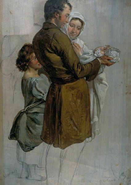 Curator: This is "Disputing the Billet" painted by George Harvey in 1827. It's an oil on, well, we don't have the support specified here, but likely canvas. A fine example of early 19th century genre painting. Editor: Oh, I love the tenderness in this scene. There's this lad kneeling, clutching a dog as if it’s the most important thing in the world, and the woman behind him, gazing out with such a knowing expression. There’s something heartbreakingly sweet about it, isn't there? Curator: Harvey was a Scottish painter who found great success in depicting scenes of everyday life, especially those highlighting rural customs. The "billet" in the title likely refers to a lodging assignment, perhaps connected to military service. So this seemingly simple domestic scene might touch upon broader social themes, such as family anxieties related to war. Editor: That adds a layer of depth I hadn't immediately considered! I was caught up in the simple human connection; that shared vulnerability in the boy's posture. Curator: He’s tapping into the romantic sensibilities of the era. People started to appreciate the emotion, innocence, and authenticity they associated with humble folk, especially those far removed from the pressures of city life. And we see this throughout painting of the era as urbanisation increased rapidly, influencing sentimental responses in visual culture. Editor: It’s amazing how paintings like this serve as little time capsules. You see the fashion, hint at socio-economic conditions, but the human expressions are the constant throughline that hits you across the centuries. And the loose brushwork is fascinating; it's like a captured moment, not quite fully formed, as though the past is glimpsed only momentarily. Curator: Indeed. The very lack of precise detail makes the image even more accessible. It feels more immediate. That sense of being incomplete mirrors our fragmented understanding of the past itself, a story we can never fully know, only piece together. Editor: A fragment that speaks volumes, really. You can see Harvey took a lot of care in composing this, despite the sketchy execution. There's an underlying empathy in this little slice of life. Curator: Ultimately, "Disputing the Billet" reminds us of the deeply intertwined relationship between personal experience and socio-historical context, allowing us to consider how both artists and audience interpreted those values in the early 19th century. Editor: It certainly nudges us to consider a broader perspective of the era's art, and hopefully invites new questions when appreciating works from this period. Thanks for this!