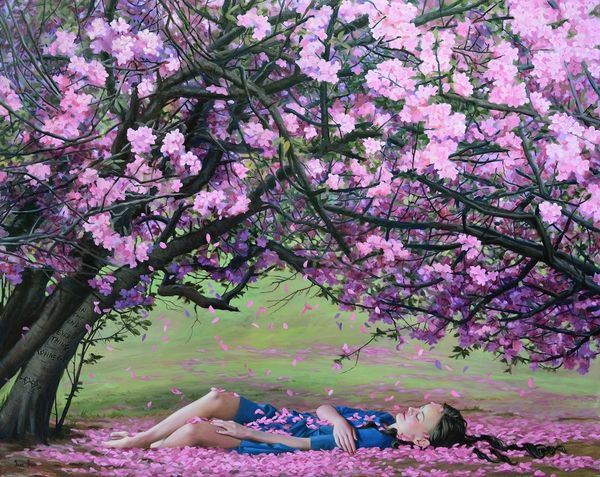 Curator: Jana Brike’s acrylic-on-canvas painting, “Spring Break,” created in 2018, immediately throws us into an immersive and surreal scene. What are your first thoughts? Editor: My initial reaction is a sense of idyllic disconnect. There’s a captivating tranquility juxtaposed against what appears to be a recognizable urban backdrop, a dreamlike escape maybe? Curator: Exactly! I find the juxtaposition incredibly compelling, a young woman surrounded and seemingly almost consumed by the dense bed of pink petals, rendered against a cityscape background. Let’s delve a bit into this. The use of acrylics really brings out a certain vibrancy here, emphasizing this fantastical element of escaping into a manufactured natural scene. Editor: Considering our fraught relationship with fabricated imagery in art, especially those idyllic paintings promoted in salons to construct notions of femininity, what does this work achieve? Is Brike making a comment about our consumption of art? Is she promoting some form of artifice? Curator: The social element of viewership cannot be discarded in its study. "Spring Break," as Brike creates it, feels deeply entwined with themes of idealized youth, alienation, and perhaps the synthetic experiences we've come to normalize in our relationship to nature. It speaks to contemporary anxieties, maybe, about our disconnection with genuine experiences. Editor: The symbolism of the cherry blossoms is prominent here too. They represent a beauty that's both fleeting and potent. Given Brike’s integration of city architecture with nature, and as our collective interaction with it intensifies online, perhaps "Spring Break" is suggesting that virtual existence, albeit temporary, also has power. Curator: Absolutely, that's a pertinent point. And that could serve as an encouragement rather than just a critique. It feels as though Brike prompts a needed discussion. Does art only reflect life? Or, does the simulacrum that art provides transform societal norms and how we react to them? Editor: Yes. Ultimately, it invites the viewer to confront this intersection, doesn't it? It doesn't condemn, it questions and provides an aesthetic gateway for discourse. Curator: Precisely, and through that discourse, allows for growth and change, just like spring itself. Editor: A refreshing perspective indeed. "Spring Break" then, is much more than just an aesthetically pleasing work; it is a reflection of our era.