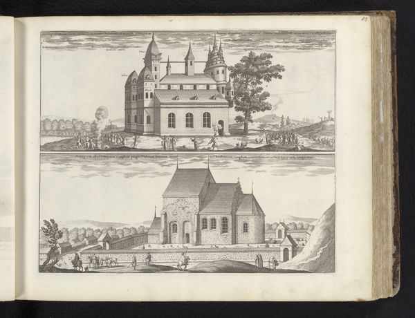 Curator: This delicate print offers us a "Gezicht op slot Hässelby" or "View of Hässelby Castle," created in 1679 by Jean Marot. Editor: The stark, almost skeletal lines evoke a sense of measured elegance. It feels very controlled, like looking at a precisely calculated equation of space and form. Curator: Precisely. Marot was known for architectural renderings and this piece beautifully exemplifies the formal Baroque style. It was a period heavily influenced by absolutism, and prints such as this played an important part in shaping perceptions of power through controlled symmetry and spatial harmony, showcasing the castle and by extension its aristocratic owners as paradigms of order. Editor: Tell me more about how you view the composition itself as working towards this controlled effect. Curator: Consider the almost unwavering symmetry—each pavilion mirroring the other. Also note how the horizon cuts the frame quite evenly between the depiction of the grounds versus the expansive sky, creating a sense of balance and a hierarchical clarity that reinforces the castle as the center of all spatial intention. The sky with it's gentle almost perfectly horizontal lines seems like a gentle sky which, when contrasted to the sharpness of the pen work, creates a dramatic, somewhat sublime image that feels uniquely of its moment. Editor: Interesting! The people dotted about almost seem like afterthoughts, shrinking against the architectural might, I wonder, might it also imply the limited impact of those figures' lived experience as opposed to the grand design? Curator: That's a fair point, it certainly underlines the importance of context. In the end, it shows a conscious attempt to organize the natural world according to a rational framework – perhaps even dictating its reception. Editor: Absolutely. It's funny, such intentional composition almost creates an illusion of permanence, even though we know the landscape is continuously shifting and evolving socially. I can't help but feel melancholic, viewing it and realizing so much about its subjects have changed irrevocably. Curator: I think you bring a crucial aspect to our appreciation. By blending the rigorous structure with its softer atmospheric qualities, the piece opens a dialogue about not only historical contexts, but its temporal, and perhaps melancholic existence.