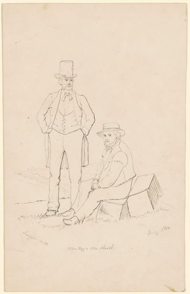 Curator: Welcome. We're standing before Pieter van Loon's drawing, "Boekverkoper met klant voor een boekenkraam," placing us in front of a book stall somewhere between 1811 and 1873. Editor: My first thought? A dry wit hangs in the air of this scene. The elongated figures almost feel like they’re acting out a private joke, don’t they? Curator: Precisely. Van Loon’s work, rendered in pen and pencil, utilizes a very particular type of academic realism. The figuration is key—look at the deliberate caricature; the contrast of textures achieved solely through line work... Editor: They look a bit severe, especially the book seller, but is he making fun of his customers or his work? He reminds me of shopkeepers I knew when I was a kid. He has that manner about him of being completely detached, like he's resigned himself to his workaday existence. Curator: It's worth considering the text scrawled beneath the drawing, too. Editor: Right! How are great writers sometimes appreciated in foreign countries... there’s something self-aware in its placement that gives the drawing another layer, no? Curator: Absolutely. The visual elements combined with the textual underscore point towards a pointed commentary on both the appreciation of literature, and potentially the role of the seller within that transaction. Editor: The beauty, to me, is how he manages to pack so much into such an apparently simple sketch. The subtle body language, the precise economy of line...you just get the sense these two know their routine backwards and forwards. It's both comical and a tiny bit sad, like a perfectly observed short story. Curator: Indeed. The very sparseness of materials only underscores how effective the composition is overall, communicating far more with the most minimal tools, achieving both character and social commentary. Editor: To think a simple drawing of a bookseller and his customer could reveal so much...art has the knack of throwing a mirror to our own daily rituals, no?