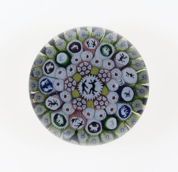 This paperweight was created by the Compagnie de Saint Louis using lampwork glass. It represents the highpoint of glassmaking as a luxury industry in nineteenth-century France. The overall effect of the paperweight is achieved through painstaking labor. Individual glass rods are bundled together into patterned canes, which are then sliced into segments and arranged in a tight, circular formation. This requires precise coordination by a team of glassworkers, each with specialized skills. The central motif, with two silhouetted figures, indicates the level of complexity involved. The entire assembly is then encased in clear glass, magnifying the intricate design. Objects like these represent a paradox. They required intense skill, but were ultimately conceived as a beautiful desk accessory, a purely decorative object. This reflects the tension between the handmade and the industrial, fine art and craft, that characterized the period. By considering the social context and the labor involved, we can more fully appreciate the intricate beauty of this paperweight.