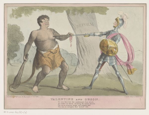 Curator: This image practically jumps off the toned paper! I’m struck by the contrast – this powerful figure looming over what appears to be a scurrying, fearful mob. Editor: Precisely. This print, possibly from 1880, is titled "The Democratic Samson and the Republican Philistines," a lithograph drawing by Joseph Keppler, now in the collection of the Art Institute of Chicago. Keppler masterfully employs political commentary through allegorical representation. Curator: Absolutely. We see a classical figure—Samson, no doubt—linked to the Democratic party, positioned beside a drooping donkey adorned with the word “Democracy.” The weight of that image! This is not merely a picture, but an intervention in a cultural discourse. Who are the Republican Philistines he’s gesturing towards, exactly? Editor: That mass represents the Republican Party, portrayed as disorganized and fleeing. Observe the expressions Keppler gives each face—fear and disarray etched in their features. It's a narrative laden with anxiety regarding Reconstruction era policies and anxieties about federal overreach, issues of labor and industrialization. Curator: The use of Samson, known for his incredible strength, fighting the Philistines is heavy. In what way do you think the figure of “Samson” connects to marginalized groups and what do you read from his stance? The gaze demands immediate consideration to the politics, identity, and underlying class conflict. Editor: His pose, though exaggerated, lends a sense of dynamism and authority. Semiotically, the donkey is presented not only as weary, as suggested by his slouching posture but marked as "Democracy". It seems as if Keppler, perhaps, views the party with optimism? It suggests the capacity for renewal and strength is innate but has somehow diminished, given the character’s sad face. The angle creates emphasis. Curator: Do you consider that Keppler might consider them an opponent even if, allegorically speaking, this Samson looms over his “enemies”? Editor: Possibly, yet Keppler gives the Republican party a run-down quality, marked as disorganized and somewhat silly. Though, that is the nature of caricatures such as this one, the message could be less celebratory than cynical, the true intent remains beautifully undecidable in its complexity. Curator: A visual puzzle! I hadn’t considered that possibility but looking back, I agree. Political discourse then, and now, appears marked with contradictions and visual manipulation. Editor: It really highlights the layers within the lithograph and compels viewers to engage critically with political imagery.
