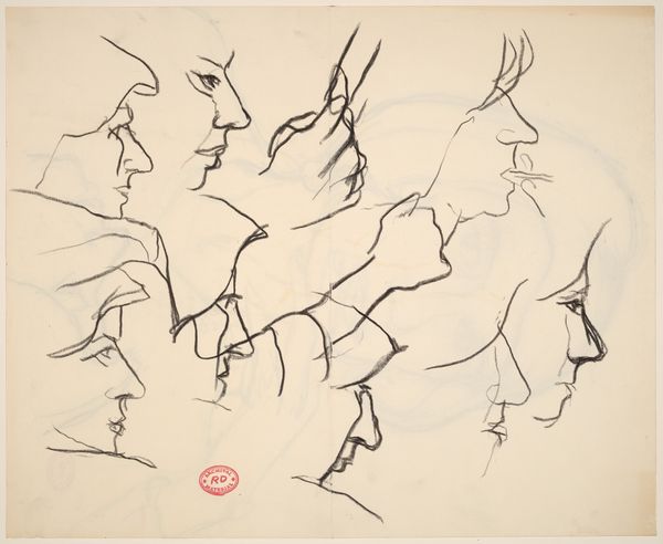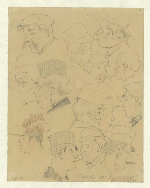 Curator: Here we have "Schetsblad met diverse studies van een vrouwenhoofd," or "Sheet with various studies of a woman's head," attributed to Gerrit Willem Dijsselhof, and estimated to be created between 1876 and 1924. It's currently held here at the Rijksmuseum. Editor: My initial thought? It feels like glimpsing a collective of quiet secrets, maybe hushed anxieties too, all caught in the same delicate web. Curator: Interesting. Consider how Dijsselhof employs pencil in this drawing. We see the subtle shifts in pressure, the hatching, creating a compelling tonal range, especially notable given the limited palette. This imbues each face with a distinct presence. Editor: It's funny, isn't it? How the simplicity of a pencil can suggest such depth. I get the sense each sketch wasn't about achieving perfect likeness, but more about chasing an elusive feeling, like trying to grasp a half-formed memory. Curator: Indeed, and it raises interesting questions about the artist's intent. Is this purely an exercise in form, or is there a deeper engagement with the subject, a psychological study conveyed through repeated visual motifs? We can observe variations in hairstyle and facial expression. Editor: Totally! I imagine the artist, maybe late at night, wrestling with one particular aspect of the face, again and again, until he felt like he had pinned it down, or, even better, set it free! Maybe each sketch is one step further in his own creative exploration. Curator: Ultimately, I'm drawn to how the composition leads our eyes across the sheet, compelling us to examine each woman in isolation and then as part of the larger collective. Editor: I feel it whispers stories. I bet if you listened carefully, you might even be able to hear their silent murmurings. Now that's something. Curator: An evocative reflection that speaks to Dijsselhof's talent for transcending simple representation. Editor: And for making a few pencils sketches look like a peek into an unknown, deeply private world!