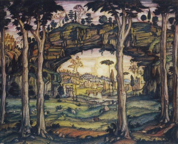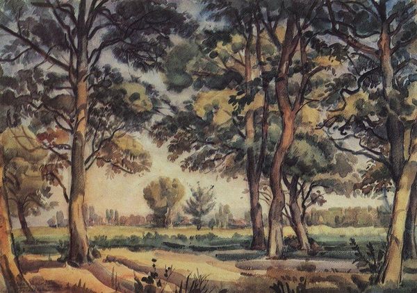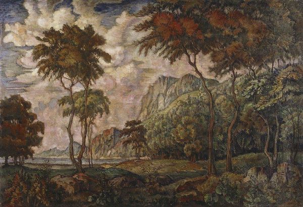 Editor: Here we have Konstantin Bogaevsky's "Autumn Evening," created in 1925. It’s an oil painting, though it almost looks like watercolor in its execution. The first thing that strikes me is the sort of desolate yet peaceful mood it evokes through its muted palette. What do you see in this piece? Curator: The strength of this painting lies in its composition. Note how Bogaevsky uses a limited color palette of ochres, browns, and grays to construct a landscape divided into distinct planes. Observe how the stark, almost geometric forms of the rocks and trees in the foreground create a visual barrier, guiding the eye towards the hazy, atmospheric distance. This carefully structured composition, although seemingly representational, emphasizes formal relationships and balances. The trees' bare branches mimic the jagged silhouettes of the distant cliffs. Editor: It’s true, the repeated shapes are quite striking. Does that contribute to its feeling of peace, that echoing effect? Curator: Precisely. The echoing of forms, in conjunction with the limited palette, imposes visual harmony across the scene, creating a sense of self-contained equilibrium. Consider the interplay of light and shadow – not for creating realistic depth, but for delineating abstract shapes and structuring the picture plane. Editor: So you're saying it’s less about capturing a specific scene and more about the arrangement of shapes and forms to evoke a feeling? Curator: Exactly. The subject is only the starting point for an exploration of pictorial space and form. The painting operates independently from any direct reference to an actual landscape or the autumnal season, instead presenting us with its constructed interpretation of it. Editor: That's fascinating; I initially perceived it as simply a landscape, but now I recognize how much of the emotional impact is generated from formal relations. Thanks! Curator: My pleasure. Observing how artists manipulate form, structure and materiality refines our appreciation and heightens the interpretive process.