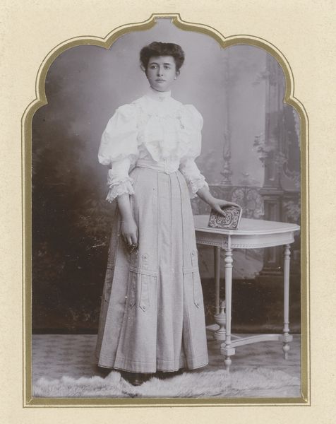 Curator: This photographic portrait, attributed to Louis Devolder, and titled "Portret van een vrouw", was created sometime between 1889 and 1914. Editor: My initial impression is one of quiet strength. The subject’s gaze is direct, but there's also a hint of vulnerability. I’m struck by the faded quality and how it almost makes her seem like a figure from a half-remembered dream. Curator: Indeed. Examining the portrait within the social context of the late 19th and early 20th centuries, studio portraits like these were significant displays of social standing and personal identity. The ornate framing itself served as a symbol of this era's values. It presents questions of societal expectations of women during the era. Editor: The framing does provide a key, doesn’t it? I'm intrigued by the woman’s attire, a light dress and that elaborate hairstyle - all signs pointing towards certain symbolic visual narratives. Do you think this could be a study on ephemeral beauty and status? Curator: I appreciate that read. I believe the subtle signs within this photograph are indicators of how social and gender roles shaped her image. We can infer some context from her confident, composed pose: an intentional act of self-representation challenging traditional notions of feminine submissiveness. Editor: Yet, the use of a restrained color palette and soft focus might be trying to reflect upon something. The picture could reveal something on the quiet domestic sphere this woman existed within, revealing some deep cultural values. Curator: Exactly. The soft focus and ethereal lighting aesthetic suggests perhaps, that the artist attempts to hint towards something just out of the subject’s reach, reflecting society’s restrictions of women at the time. Her eyes reveal this complex tension in the face of rigid gendered societal roles. Editor: So, beyond just surface-level realism, this photography presents a visual language revealing nuances within that historical period. We have seen similar elements in art, representing not just who someone was, but perhaps who she aspired to be. Curator: Right. And it's that duality, the interplay between perceived image and asserted identity, which gives it resonance even today, when issues of gender and social position remain critical topics of discussion. Editor: This exploration really makes you think how much a single image can reveal! There's a silent narrative to unravel. Curator: It certainly does. Understanding such subtle signals reminds us of how artistic images reflect profound cultural beliefs.