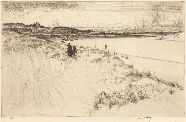 Curator: Before us, we have David Young Cameron’s etching, "The Source of the Clyde," dating from 1889. He employs ink on paper to capture a vast Scottish landscape. Editor: It evokes a profound sense of stillness. The density of the ink in the midground provides such dramatic contrast to the pale sky. Curator: Indeed, Cameron masterfully manipulates light and shadow. Observe the strategic hatching and cross-hatching, building depth and texture within the composition. The texture is very fine overall. Editor: For me, the most compelling element is the clump of tall grasses in the foreground. They immediately suggest a link between the viewer and the landscape—almost as if you're right there at the Clyde's very genesis. Water sources have historically represented purity and renewal, don’t you think? Curator: That's an astute reading. Symbolically, of course, sources hold great power. However, it also anchors the eye, allowing us to appreciate the subtle variations in tone and the sophisticated tonal gradations across the land. It’s important to notice how the lines work within the form and direct the eye. Editor: So you see his formal approach as reinforcing the subject, even perhaps deepening its symbolic weight? Curator: Precisely. By concentrating on technique, one discerns an interplay between the concrete and the symbolic. The stark linearity contrasts perfectly with the romantic sensibility he clearly is trying to convey with the clouds, sky and faraway landscape. Editor: And the cultural narrative. I'm interested in how this depiction of the Scottish landscape invites the viewer to reflect upon notions of heritage and national identity. The Clyde, after all, has been central to Scotland’s industrial and cultural narrative. Curator: Absolutely, and Cameron’s piece embodies that spirit through carefully constructed form. Editor: Considering his careful balance of light and shadow, as well as historical symbolism, this seemingly modest work offers layers of meaning. Curator: Indeed. And what at first glance might appear to be simply a traditional landscape reveals the power of pure form.