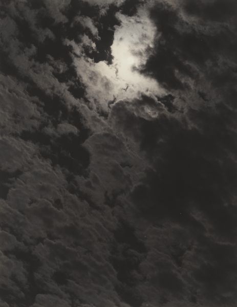Curator: Here we have "Equivalent K3," a gelatin silver print by Alfred Stieglitz from 1929. It's part of a larger series that he referred to as "Equivalents." Editor: My first thought is just how incredibly atmospheric it is. A brooding sky, full of shadow and light fighting for dominance. It feels heavy with unspoken meaning, charged with a latent anxiety. Curator: Exactly! Stieglitz sought to capture not just a scene, but a feeling, an emotion. The clouds are a metaphor, a symbol for inner states. The 'Equivalents' are meant to be equivalent to his own feelings at the time, expressing the artist's inner emotional landscape through abstract symbolism. Editor: I find myself wondering about that emotional landscape. Given the time period, the interwar years, with the rise of fascism and social upheaval, how much of that seeps into the image? The murkiness, the almost violent contrast – it speaks to a deep sense of uncertainty, perhaps even dread, which might be read as a societal mood of impending chaos and disaster. Curator: Absolutely, context is vital here! The "Equivalents" were, in part, a response to criticism that his earlier work focused too much on subject matter. He wanted to prove photography could be pure expression, like music, divorced from direct representation, accessing something fundamental. The clouds could stand for many things, even his relationships. Editor: I am fascinated that Stieglitz suggests the purity of expression while being unable to evade those inescapable anxieties associated with war, loss and inequality which influenced even the act of capturing those cloudscapes. This interplay between seeking freedom from context while intrinsically being embedded within it really adds another complex dimension to this artwork. Curator: He sought a universality of feeling, something timeless and relatable regardless of context, communicated through the evocative power of these images. His focus remained, it could be argued, on making external his emotional conditions using photography as a cathartic process. Editor: And ultimately, it’s the dialogue between intention and interpretation that makes art so compelling. That constant push and pull informs and enriches our experience of seeing it. Curator: Precisely! "Equivalent K3", far from being a mere study of clouds, becomes a mirror reflecting our own feelings, anxieties, and hopes.