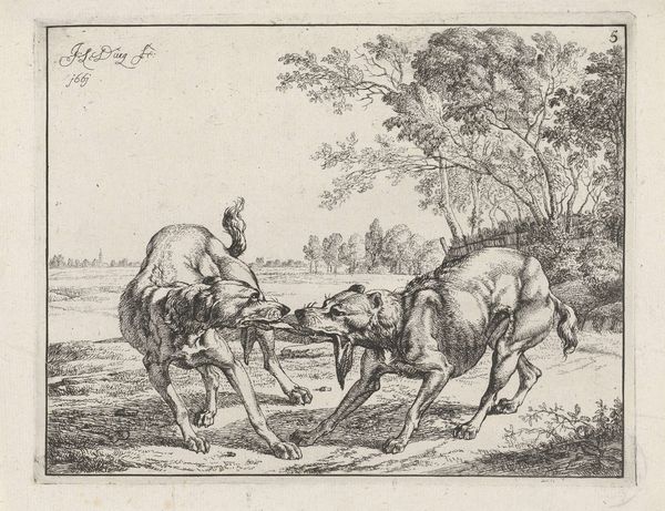 Johan le Ducq created this etching, "Two Dogs in a Landscape," around 1661, using line and form to structure a deceptively simple scene. The composition divides rather cleanly between foreground and background, each populated by separate figures. In the foreground, the titular dogs dominate the space. One lies prone, heavy with sleep, while the other stands alert, its gaze directed off-frame. The contrast introduces a subtle tension, hinting at an unseen element that animates the otherwise still landscape. In the background, Le Ducq sketches a hunting scene, complete with armed figures on horseback, suggesting a narrative context for the dogs' presence. Semiotically, the dogs represent domestication and their relation to man, the landscape, nature. The interplay between the dogs and the hunters, foreground and background, creates a dynamic relationship within the static image, prompting reflection on nature, culture, and control.
