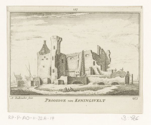 Abraham Rademaker etched this view of the Konings Uithof ruin in 1573, capturing a scene laden with symbols of decay and the passage of time. Ruins, as a motif, carry profound cultural weight. They echo through art history from Piranesi's romantic depictions of Roman ruins to contemporary artists exploring themes of memory and loss. Consider the psychological impact, the confrontation with mortality. Ruins remind us that all things are impermanent, stirring a deep-seated awareness of our own fleeting existence. Observe how the architectural elements – broken arches and crumbling walls – evoke not just physical destruction, but also the decay of institutions and ideologies. The very stones whisper stories of vanished power. This melancholic mood invites viewers to contemplate the cyclical nature of history. The ruins reappear as potent symbols, constantly revisited, reinterpreted, and revived in artistic expressions across centuries.