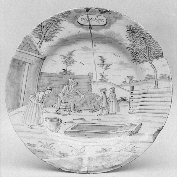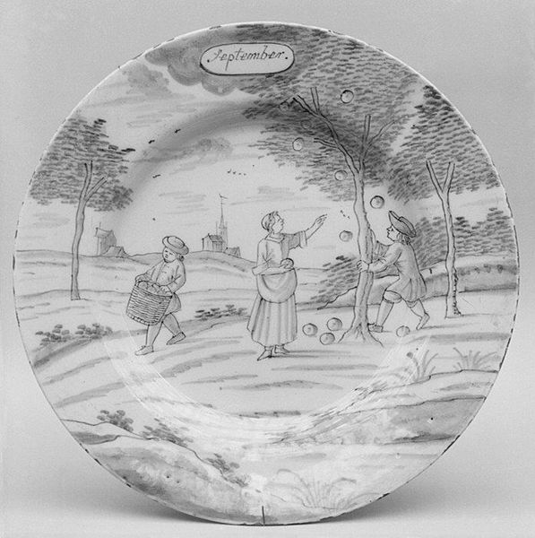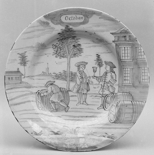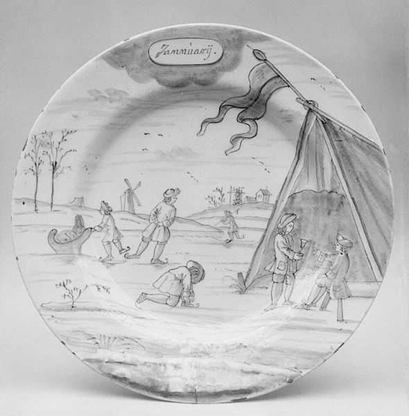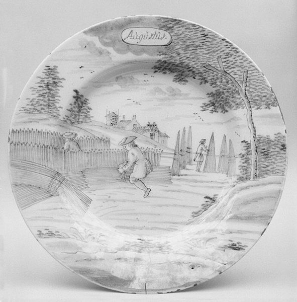 Curator: This object is a plate, part of a larger set, crafted between 1759 and 1793 by De Porceleyne Bijl. It resides here at the Metropolitan Museum of Art. Editor: It feels so fragile! The delicate monochrome landscape seems almost dreamlike. Curator: Indeed. What we see here is an example of Dutch Delftware. It uses ceramic materials and ink to simulate the style we would normally find in drawings and paintings of the Dutch Golden Age. Editor: I see immediately what you mean about that aesthetic borrowing. The landscape itself feels pregnant with symbolism. Two figures rest near what seems a fence, a shepherd guides livestock towards a town with prominent steeples in the distance... It all feels carefully arranged to signify something. Curator: And how does it speak to you? Editor: The plate is inscribed with the word "Meij" – May in old Dutch spelling– hinting perhaps at the spring season, renewal. The fence creates an enclosure or division. Does it denote social stratification, land ownership, or perhaps something more intimate? The resting figures might represent a temporary escape from labor or a romantic tryst within nature's confines. Curator: These porcelain objects served as important status symbols, reflecting societal shifts. Picturesque pastoral scenes reminded the rising urban merchant class of the disappearing rural lifestyle, which shaped their cultural identity through constructed representations. Editor: I hadn’t thought about its social role like that, more the nostalgia it conjures through a shared artistic vernacular. The depiction of landscape becomes not just scenery, but cultural shorthand. The fence can symbolize boundaries while the landscape allows for a reminder of a perhaps unattainable pastoral harmony. Curator: Exactly. It represents this complex interplay of desire, memory, and social status so prevalent in 18th-century Europe, now rendered into domestic art. Editor: Seeing the detail again after discussing... that initial fragility transforms into quiet strength. There is much embedded in what appears at first to be simple decoration.