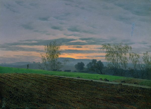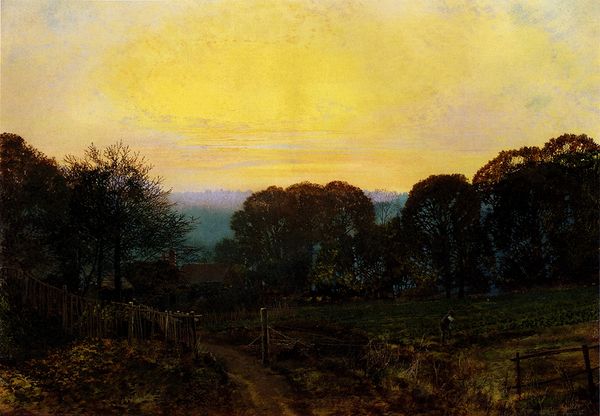 Curator: Looking at this canvas, one can’t help but feel a deep sense of calm. The way the light filters through, it's just... ethereal. Editor: Indeed. This is Albert Bierstadt’s "New England Landscape," painted in 1889, rendered in oil. It's very characteristic of the Hudson River School's plein-air painting techniques. But what resonates beyond just skillful landscape rendering, for you? Curator: Oh, I feel like I'm walking through that field. The muted gold of the sky blending into the rolling hills gives me such a warm feeling, even a bit melancholic—almost as if the sun is setting on a chapter of my life. Does that make sense? Editor: It absolutely does. It's important to situate such idyllic portrayals within their socio-political reality. The late 19th century was marked by accelerating industrialization and urbanization. So, these landscape paintings really provided a comforting retreat, reflecting a yearning for simpler times, although that simpler life usually excludes narratives from workers or indigenous inhabitants. Curator: That’s a great point. It’s easy to get lost in the pretty picture and forget about the bigger story. Thinking of this longing for an idealized past—doesn't that risk romanticizing colonial expansion into the 'untouched' wilderness? Editor: Precisely. Hudson River School paintings are undoubtedly visually stunning, but it’s imperative to acknowledge that such works can sometimes overshadow the environmental and societal consequences of westward expansion—the brutal treatment of native people, the commodification of nature. It speaks to whose “Eden” is being visually celebrated. Curator: I see your point. Maybe there's a tension, even in something as outwardly serene as this canvas, that's just ripe for critical reflection, don't you think? Like, it’s beautiful, but... beauty can be deceiving, almost like a mirage sometimes. Editor: Exactly! This piece shows us both the beauty of artistic technique and the vital necessity to contextualize that beauty within history. A crucial dance between form and broader social dialogues. Curator: Well said. I'll never look at a landscape the same way again! Editor: And hopefully, we can start to recognize the narratives of erasure within celebrated works and become more conscious viewers overall.