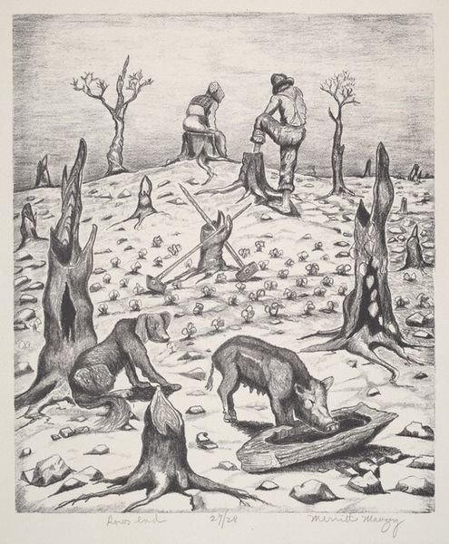 Editor: This striking oil painting is "Bear Hunting" by Niko Pirosmani. I’m particularly drawn to the dramatic, almost theatrical way the scene is set, especially the stark contrast between light and shadow. What catches your eye when you look at this work? Curator: I notice immediately the potent symbols present, reflective of primal anxieties and cultural memory. Note the upright bear – an archetypal figure representing untamed nature, but also immense strength. Observe how the hunters are rendered – are they heroic or driven by a more base instinct? Editor: They seem… a little disorganized, almost comical. The central figure wielding the axe looks rather frantic. Curator: Exactly! This disruption of traditional heroic narratives is crucial. The hunt, historically a symbol of power and conquest, is presented here with a certain…awkwardness. The dark palette is also striking, reinforcing the dreamlike quality and sense of unease. What could the artist be saying about humanity's relationship with nature, our anxieties surrounding control and order? Editor: So, you're suggesting it's not just a straightforward depiction of a hunt but something deeper? Curator: Precisely. Consider the bear, typically a figure of fear. Is it truly fearsome, or a projection of our own inner demons? These symbolic inversions resonate across cultures. Consider also the psychological weight – the hunt, often portrayed as triumph, here feels closer to a frantic struggle against an overwhelming force. Do you think Pirosmani might be hinting at a shift in how we perceive our place in the world? Editor: It’s interesting to consider how symbols like the hunter and the hunted have shifted. This has given me a lot to consider about visual language and the way artists re-interpret cultural narratives. Curator: Indeed. This exploration unveils layers of meaning far beyond the surface narrative. Recognizing those historical, emotional, and psychological symbols help us uncover its core.