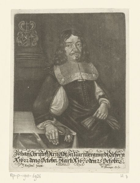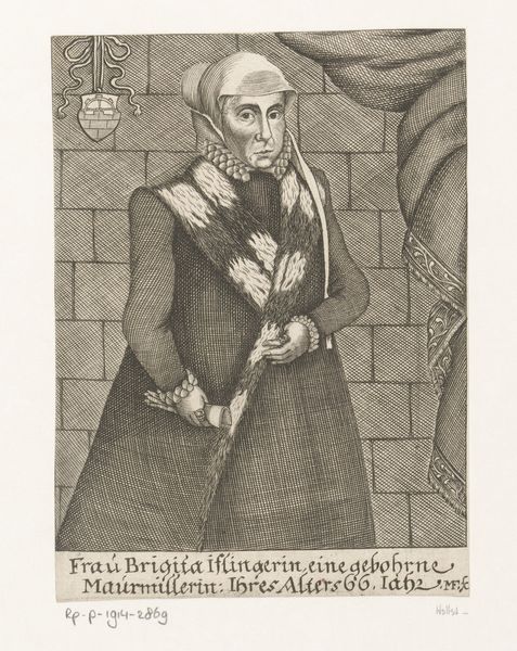 Curator: This engraving, completed in 1676 by Michael Fennitzer, offers a portrait of Dorothea Sabina Helffrich. I find it a fascinating example of late Baroque portraiture. What's your initial take on it? Editor: Somber, certainly. The dark tones create a gravity. Yet there’s an interesting interplay between wealth—implied by the fur and lace—and a devotional atmosphere given the little religious depiction in the top left corner. Curator: Exactly! The contrast sets the tone. Note also the inscription beneath her. The engraving bears text imploring for solace in parting and help avoiding corruption, common motifs, but its integration is unusual here. How does this blending of portraiture with religious supplication reflect social norms? Editor: Perhaps this reflects an attempt to immortalize the subject, not only as an individual of status but as a virtuous soul. Portraiture had an increasingly public role in the 17th century. Who got to be portrayed, how they were portrayed, spoke volumes about the social hierarchies of the time. This isn't just Dorothea; it’s Dorothea *approved* by the mores of her era. Curator: I agree, and I see those visual decisions underscored by iconographic ones. Examine her eyes. The artist captures her with soft realism, and they seem directed out and slightly down as if interrupted from prayer. It encourages introspection for the viewer. How does the interplay of realistic rendering with idealized presentation shape our view of Baroque identity? Editor: It's a constructed identity, certainly. The pose is deliberate, calculated to inspire both awe at her station and sympathy for her piety. Consider also the location of the coat of arms in the upper left next to what appears to be a figure and crucifix... it shows a strategic combination of the worldly and the divine. Fennitzer uses light and shadow, engraving and text, to fashion an image deeply invested in propagating particular virtues for a prominent figure. Curator: A powerful comment on the performative nature of status! I believe that even the fur trim of the hat operates on dual registers, demonstrating a worldly fashion sense and also humility by implying the subject does not fear future suffering. Thank you for helping elucidate how the composition and construction offer an argument about the sitter’s legacy and virtue! Editor: My pleasure. The artifice speaks volumes if you listen. This engraving exemplifies the period's skillful use of visual rhetoric in shaping public perception.