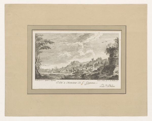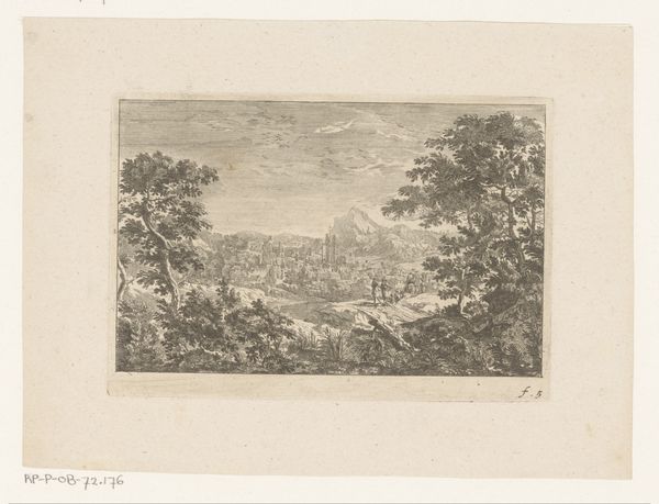Paolo Anesi created "Landschap bij Rome" using etching, likely sometime in the mid-18th century. Etching involves covering a metal plate with a waxy, protective ground. The artist then scratches an image into this ground, exposing the metal. When the plate is submerged in acid, the exposed lines are eaten away, creating grooves. Ink is then applied to the plate, filling these grooves, and the surface is wiped clean. Finally, the plate is pressed onto paper, transferring the ink and creating the print. The linear quality of the image is a direct result of this process. The cross-hatching and fine lines create a sense of depth and shadow. The way the acid bites into the metal also affects the final image, giving it a unique texture and tone. The success of the print depends on the etcher's skill and judgment, as it would have taken immense precision and labor to create the landscape we see before us. Looking at art through the lens of its making helps us appreciate the skill and labor involved, as well as the social and cultural context in which it was produced.