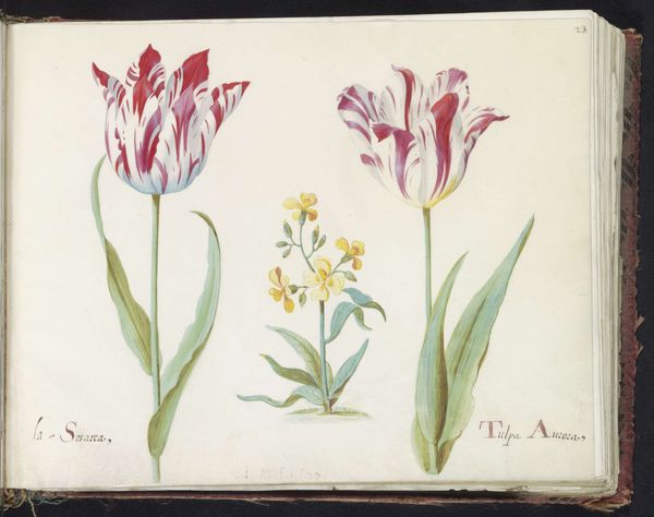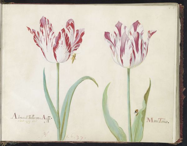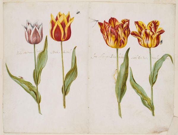 Curator: Welcome. Before us is "Sheet from a Tulip Book," a watercolor and ink drawing on paper, created around 1640 by Jacob Marrel. It resides here at the Rijksmuseum. Editor: My first thought is: delicate obsession. There's such fine detail in the rendering of each bloom and even the little insects. But there's a slight melancholy as well. The flowers are past their prime. Curator: It certainly encapsulates a key period. The Dutch Golden Age was marked by immense prosperity, fueled in part by tulip mania. Tulip books, like this sheet comes from, served as catalogs for potential buyers. They showcase coveted varieties with precise detail, a necessity before color photography. Editor: So these illustrations weren't just artistic expressions, but a visual commodity index of a speculative bubble. The named specimens – the 'Naire Wite' and 'S. Peter Roose' – each held value, literally? Curator: Precisely. Marrel, along with other artists, played a crucial role in the trade. The highly detailed depictions highlighted the unique characteristics of each bulb. Color variegations, stem length, and even subtle flaws could influence prices dramatically. They were propagating and perpetuating desires through imagery. Editor: Look closely, and it is more than pure documentation. These blooms and the insects – tiny dragonflies and ladybugs—exist on this blank plane that brings an emotional quality. We sense time, transition, the brevity of life and luxury... there's something quite vanitas-like in the composition. The artist seems keenly aware of the fragile market in representing the withering beauty of each. Curator: I agree that tension permeates. Even those insects! We tend to perceive tulips as symbols of opulence. But those little creatures serve as potent memento mori reminders of life's transience. Their presence implicates how human economic systems affect the environment, as well. These are luxury objects that rely on exploited ecologies. Editor: That is such an important insight. What seems on the surface an elegant still life opens into wider societal considerations on how art becomes implicated in global power systems. Curator: Indeed. This work serves as a fascinating portal, reflecting the complex interplay of commerce, art, and ecological concern within the historical landscape. Editor: Thanks. Seeing the drawing, and understanding the political-economic dimensions adds so much to what one might initially perceive about such period pieces.