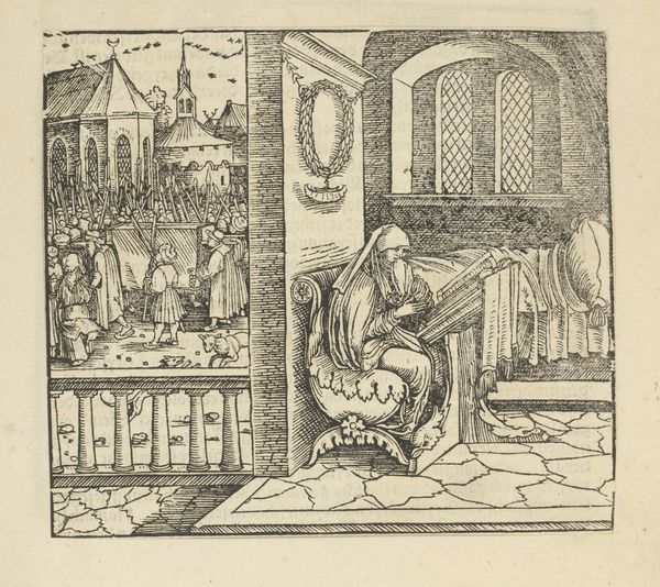 Curator: Here we have a woodcut, now held in the Rijksmuseum, by Hans Schäufelein entitled "Two People Praying in a Bedroom," dating from around 1490 to 1538. Editor: The immediate feeling is of stark devotion within tight constraints, literally. The linear density presses down, that incredible texture creating such a rigid yet intimate space. Curator: Absolutely, there’s a potent sense of internalized piety here. Note the figures themselves, kneeling in prayer, positioned centrally. The candlelight between them and their bed suggests a moment of quiet introspection before, or after, sleep. We often see prayer as something performative, or public but this image is quite private. Editor: And look at the linear quality itself. Notice how the parallel hatching, cross-hatching and densely packed lines construct form, depth, and texture? It is all achieved through the orchestration of line—its thickness, density, and direction. Curator: The interior space has all the recognizable symbolic elements we’d expect, reinforcing a sense of established faith and social order. The patterning of the bed's fabric is intriguing; its meaning, however, is less obvious to contemporary eyes, though those of the era would immediately grasp its cultural import. Editor: It is quite visually complicated. It creates a fascinating interplay of flat surface and illusionistic depth. The formal choices are striking; a somewhat strange amalgamation, stylistically, where linear rigidity meets almost chaotic textures. The linear patterning is so intense; a kind of baroque sensibility struggling to emerge from the Late Gothic. Curator: These kinds of contrasts are the lifeblood of cultural interpretation. We get to understand these figures and the scene depicted through a layered web of symbols, some of which will remain forever obscured, even after thorough decoding. The work opens a window into the everyday rituals and spiritual frameworks that shaped lives long ago, the psychology and cultural forces that shaped the late medieval consciousness. Editor: Indeed. Considering its materiality and skillful articulation of form through such basic linear structures has further unlocked ways of considering how Schäufelein balanced visual economy and spiritual density.