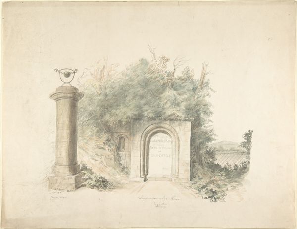 Curator: Oh, I just love how light and airy this watercolor feels. There’s a melancholic serenity about it. Editor: Well, let's delve into it a bit. We’re looking at "Ruins. Temple on the Island of Biggeh [Bîgeh, Bîjah], Nubia." It’s a watercolor created between 1846 and 1849 by David Roberts, an artist known for his detailed depictions of historical sites in the Middle East. Curator: The crumbling columns, the way the light catches the stone... it all whispers stories of empires past, you know? It reminds me of when I tried building a sandcastle on the beach last summer and the tide swept in faster than I thought, turning it to a forgotten, melancholic pile. There's a similar mood of peaceful abandonment here. Editor: Absolutely. Roberts wasn't just capturing a scene; he was engaging with complex historical and cultural narratives. Nineteenth-century Orientalism often framed the East as decaying, contrasting it with Western modernity. This image participates in, while perhaps also subtly questioning, such constructions. Curator: Questioning it? Hmmm... Perhaps. Those people gathered among the ruins; it adds a human element, a suggestion of continuity. But also maybe confirms the colonizers' visions of locals appropriating past glory without real "understanding." Though I choose to believe there are more benevolent exchanges happening in this scene. I feel it when I see it... but can't argue it directly. Editor: The play of light and shadow, the crumbling architecture… the piece becomes a commentary on time, power, and the legacy of colonialism itself. Who gets to write history, after all? And whose stories are amplified or erased in these representations? The scale is small, but the weight of these questions makes me reconsider "airiness." Curator: Yes, small, yes, watercolor... yes, complex colonial gazes and perspectives... This makes it hard not to project all our current anxieties of collapse into it... even though those have so little to do with whatever Roberts was thinking about, standing on that spot... Editor: I agree. This watercolor certainly holds far more than a pretty scene. Curator: Precisely! More like a doorway to so many things. Thank you for always keeping me grounded, and skeptical.