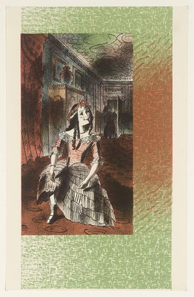 Editor: This is Barnett Freedman's lithograph, *Untitled*, from the Tate collection. The figure is really striking, emerging from a dark background. What do you see in this piece that speaks to its time? Curator: Freedman, working in the mid-20th century, captures a mood of post-war austerity and social realism. The figure's somber expression and simple clothing may reflect the experiences of many during that period. How do you think the framing impacts the viewing experience? Editor: I think the green border gives it a sense of being framed, like a window into another world. Curator: Precisely. This framing device invites reflection on the figure's place within a broader social context. It's a potent image, prompting us to consider the lives shaped by historical forces. Editor: I never considered it in that light. Thanks!