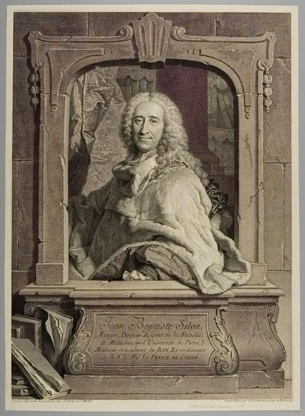 Curator: Before us is Pierre Drevet’s rendering of Cardinal Guillaume Dubois, Archbishop and Duke of Cambray. Note the dimensions: roughly 43 by 35 centimeters. Editor: The cascading drapery is the first thing I see—how it both envelops and almost overwhelms the figure. It feels so opulent. Curator: Absolutely. Drevet's masterful use of line and texture draws us into the composition. The drapery mirrors the Cardinal’s own layered vestments, creating a visual symphony of folds and curves. Consider how the light plays across these surfaces. Editor: Right, and the technique! The labor in producing those fine lines, the process of etching itself, speaks to a culture valuing display, both spiritual and material. Curator: Indeed. A fascinating interplay of faith and worldly power, captured through the meticulous work of the engraver. Editor: It leaves me pondering the cost and consequence of such elaborate displays of power. Curator: A fitting reflection given Dubois’s influence.