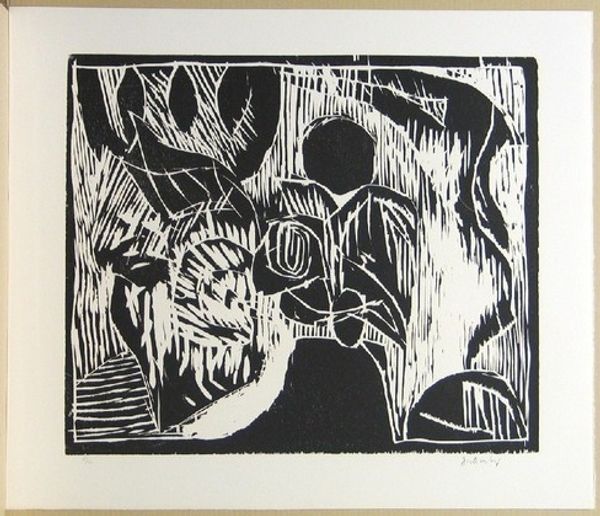 Curator: Here we have "Gethsemane" by Margaret Curtis Haythorne, a powerful woodcut print that plunges us straight into a moment of quiet agony. Editor: It does indeed! The high contrast is striking, immediately lending an almost theatrical gravity to the scene, a stage set for inner turmoil. Curator: Haythorne so beautifully captures the isolation and vulnerability of Christ in the garden. The sleeping disciples, that watchful deer... Editor: Yes, the deer is a really evocative symbol, representing solitude and spiritual vigilance. It almost feels like an empathetic observer in the drama. Curator: I find it deeply moving how she renders the scene with such stark simplicity. The emotional weight lies in the negative space as much as in the solid forms. Editor: Precisely! The starkness emphasizes that sense of spiritual struggle. A reminder of the power of symbols to evoke deep emotion. Curator: Haythorne's "Gethsemane" stays with you, doesn't it? Editor: Absolutely. It's a visual poem of sacrifice and solitude.