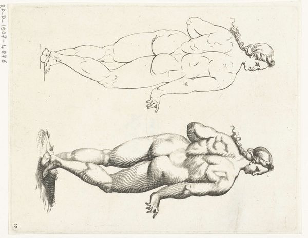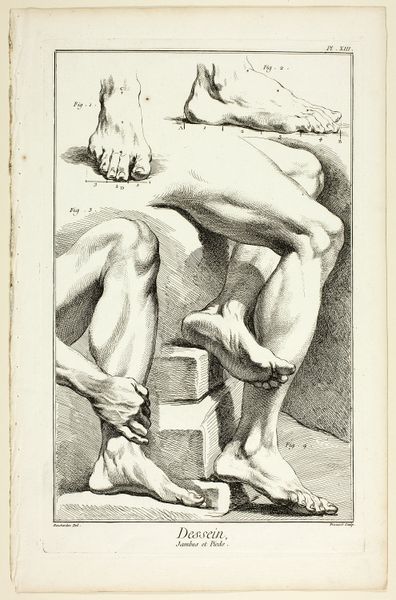 Curator: This is “Tekenvoorbeelden van armen en benen,” or “Drawing Examples of Arms and Legs,” created around 1629 by Pieter de Jode I. It’s an engraving on paper, currently held in the Rijksmuseum. Editor: My first impression is of a sculptural study. The isolated limbs have a monumental quality despite the artwork’s probable small scale. There's a clear emphasis on musculature, almost anatomical in its precision. Curator: Absolutely. Consider the period. In the 17th century, prints like these were crucial for disseminating knowledge and artistic styles. They weren't just aesthetic objects, but pedagogical tools offering examples to aspiring artists. Editor: Focusing on the formal elements, I see the masterful use of line to create volume and shadow. The hatching technique is exquisite, defining the form with incredible detail and conveying a sense of depth. Curator: Indeed. These drawings served as models of idealized masculine strength. However, looking through a critical lens, one can observe a certain detachment. The absence of torsos creates a fragmented, almost disembodied vision of masculinity that speaks to ideas around power and vulnerability. Consider that the work’s title is literally, Examples. It seems Pieter de Jode the elder produced examples for others to emulate, a fascinating interplay of form, figure, and historical representation. Editor: I would agree about that level of remove. From a structuralist point of view, each limb operates almost as an independent signifier of strength, even desire, yet it lacks context. The semiotic reading suggests an objectification – an analysis reduced to component parts, devoid of complete humanity. Curator: Precisely, but consider also the act of artistic interpretation that comes after seeing this example, where these depictions get applied to the (almost always male) heroes, gods, or figures from history painted during the period. It raises questions of whose bodies get canonized and for what purposes. Editor: I concede the print's deeper sociocultural significance. Its pedagogical intention reveals its own historical bias – a very limited, if skillfully rendered, ideal. Curator: Agreed. It demonstrates the importance of recognizing prints and drawing not simply as artistic compositions, but as historical artifacts enmeshed within systems of knowledge, gender, and class. Editor: A reminder that even the most apparently formalist study inevitably holds implicit narratives. Thank you for illuminating those connections!