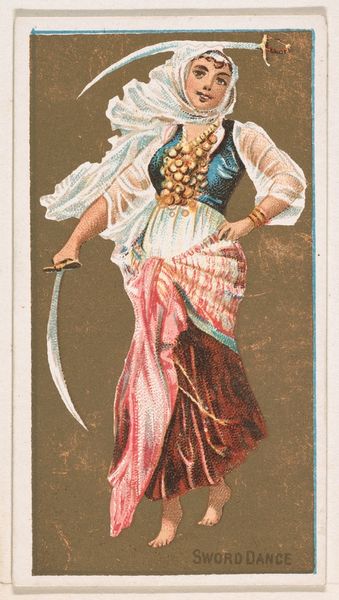 This lithograph was produced by Kinney Bros., a tobacco company, as part of their “National Dances” series. Our eyes are immediately drawn to the dancer, her shawl, and the rhythmic movement suggested by her pose. Dance, throughout history, has been a potent symbol of cultural identity and expression. From ancient fertility rites to courtly ballets, it embodies a community's shared values and stories. The shawl, a simple piece of fabric, also carries layers of meaning. Across cultures, shawls have signified status, modesty, and even mourning. Consider how the whirling dervishes use movement to reach spiritual ecstasy. In our dancer, the shawl becomes an extension of her body, a swirling vortex that captures the viewer’s gaze. This connects to the ancient human desire to transcend the mundane through movement and adornment. The dancer’s lively movement can evoke a feeling of exhilaration, engaging our collective memory and subconscious associations with dance, joy, and cultural pride. The dance becomes a non-linear, cyclical expression that will continue to resurface and take on new meanings.