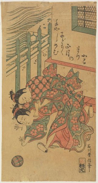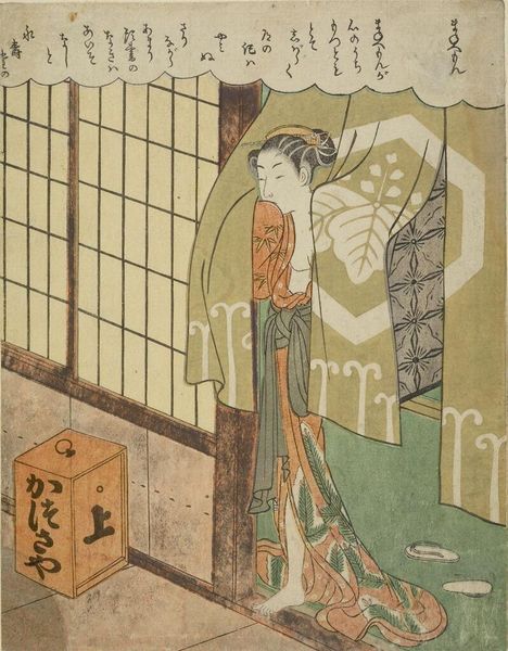 Curator: Suzuki Harunobu's "Parody of Ōta Dōkan (Woman with Branch of Yamabuki)," uses woodblock print on paper to depict a woman in a doorway during a rain shower. Editor: There's a delicate melancholy here, a quiet stillness emphasized by the vertical lines of rain and the doorway. Curator: Harunobu’s works, popular amongst the emerging merchant class, often reworked classical themes into contemporary scenes of everyday life. Editor: The artist's precise use of line and color creates a visually striking composition, drawing your eye to the woman's gentle features and the subtle details of her kimono. Curator: Her dress, patterned with irises, provides an insight into the textile production and consumption during the Edo period. Editor: It's interesting how the artist captured such a wealth of detail in such a small format. Curator: Indeed, and considering the print's dimensions, the degree of detail speaks to specialized artistic and labor practices. Editor: It leaves me contemplating the quiet moments of beauty hidden in everyday life. Curator: I am left reflecting on how artists navigate evolving social structures to challenge and re-evaluate conventional artistic themes.