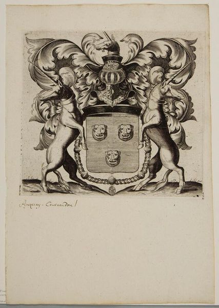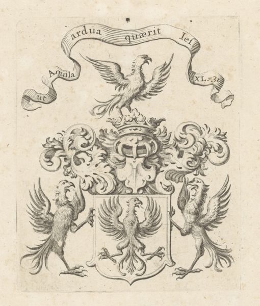 Curator: Standing before us is a piece titled "Vignet met het wapen van de stad Bern," or "Vignette with the Coat of Arms of the City of Bern." It's dated somewhere between 1796 and 1862, created using ink, engraving, and drawing. The artist is Franciscus Johannes de Hondt. Editor: My initial thought is…intriguing. There’s a somewhat serious tone, a classic, stately vibe, but also something oddly whimsical about a bear in a collar standing next to a rather fierce lion. Curator: Whimsical, yes, perhaps the artist was channeling a particular symbolism? This isn’t just decoration. Think of the lion, a traditional symbol of courage and strength. And here, a bear, also powerful, yet often associated with more earthy, grounded qualities. Editor: The bear feels significant—anchoring the lion’s bravado, perhaps. It also speaks to Bern’s identity; I believe the bear is a key part of their heraldry. It lends an undeniable cultural memory. Those seemingly simple ink lines communicate so much history and identity. Curator: Precisely! The overall style leans into Neoclassicism. Notice the geometric elements, a real emphasis on order and clarity. But within that framework, De Hondt finds space to present the coat of arms of Bern with symbolic expression. Editor: You’re right. The clarity almost emphasizes the weight of each symbol. That crown looming overhead… power, authority, aspiration—layered meanings. The inclusion of the "SPQB" adds a dimension to this, I can't help but wonder its meaning and intent. I can't say for sure but these kinds of visual markers tend to invite questions of how power speaks across generations. Curator: A fair assessment. And indeed a potent and evocative image, and yes, more information is definitely worth a deep dive in the coming weeks. Editor: Absolutely. I see in this a fascinating intersection of personal artistic expression and potent cultural identity. A real visual encapsulation of Bern.