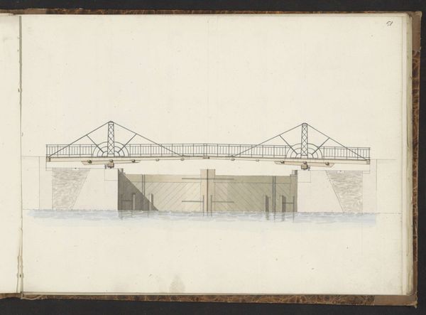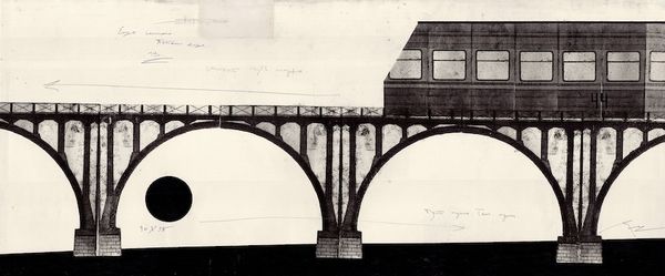 Curator: Welcome. We’re standing before Oleksandr Aksinin's “Bridge,” created in 1975 using ink, paper, and what appears to be colored pencil in a detailed print. Editor: Immediately, I'm struck by the precision. It’s almost architectural, but the soft hues create a dreamlike atmosphere, a contrast between the rigidity of the bridge and its ethereal presentation. Curator: Aksinin, although working during the Soviet era, engaged deeply with the modernist movements happening outside the USSR. Notice the interplay of geometric shapes and the meticulous linework; it’s very reminiscent of constructivist aesthetics filtered through a more personal lens. Editor: Absolutely, and considering the socio-political climate, this fascination with form takes on an interesting meaning. While outwardly depicting infrastructure, could it be a subtle commentary on control and connection, perhaps longing for linkages that extend beyond borders? Curator: It’s plausible. Bridges are inherently symbols of connection, yet here, there’s also a sense of distance. The bridge spans, but there are no figures present; the perspective emphasizes isolation more than communion. And, the image shows an uncanny superimposition of several bridges. Editor: It makes me think about accessibility too. Who gets to cross this bridge? Whose stories are erased in these grand constructions? Is this accessibility only a utopian idea? The city appears to flow underneath but we can't make it clearly. Curator: These are pertinent questions for any urban landscape, then and now. Aksinin gives us an apparently pragmatic subject, an example of engineering, but actually, presents us with a rich array of interpretive and even philosophical concerns. Editor: The way the natural elements are shaped interests me as well; they are designed too as the structure surrounding it, so one could not ensure that a bridge links a true wild scenario. Curator: Yes, that ambiguity is part of what makes Aksinin's work so compelling. Editor: Definitely! This work acts as a subtle encouragement to rethink who creates the routes and for what purpose. It inspires one to rethink about a modern urban life. Curator: I agree. We appreciate this image due to the complex questions that raises related to societal power in an interesting era for the Soviet Union, so it still maintains its interest and is also a legacy to look forward to.