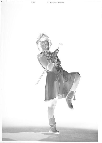 Curator: This is an untitled image by John Deusing, currently held in the Harvard Art Museums’ collection. It features a drum majorette. Editor: The high contrast and the figure's dynamic pose give it a real sense of movement. The twirling baton is almost an extension of her own energy. Curator: Indeed. The work likely captures the energy and spectacle associated with marching bands. Majorettes were powerful symbols within many communities, often tied to local pride and school spirit. Editor: Note how the composition directs our gaze upward, emphasizing her face and the confident tilt of her feathered hat. It's a masterclass in using form to convey a clear message. Curator: The picture offers an interesting perspective on the role of women in traditionally male-dominated spaces and the broader context of community identity. Editor: It's truly remarkable how much is conveyed through these simple elements of light, shadow, and shape. Curator: It leaves me pondering on the cultural shifts and the symbolic weight this seemingly simple image once carried. Editor: And it makes you want to start dancing!