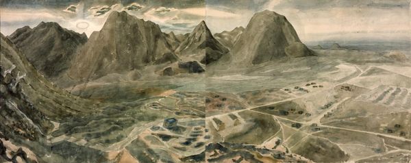 Editor: This is Nicholas Roerich’s “Boundary of Kingdoms” from 1916, a print in ink, seemingly destroyed now, sadly. The mountain range dominates the scene, with tiny figures at the lower left, cloaked and carrying something circular. There's a sense of scale, an imposing vastness that makes you feel quite small. What do you see in this piece, especially considering it was created during World War I? Curator: Well, that timing is critical. Roerich, while often labeled a mystic, was deeply concerned with cultural preservation. Looking at this print as a product of its time, "Boundary of Kingdoms" presents a fascinating commentary on the sociopolitical landscape of a world at war. Mountains often represent endurance, timelessness. The robed figures appear to be holding some kind of shield or emblem. Editor: You're right, the mountains *do* feel timeless. And that emblem… Do you think it represents a specific nation, or something more symbolic? Curator: It's intentionally ambiguous, I believe. Roerich strived to represent universal values that transcended any single nation’s boundaries, highlighting, instead, common cultural roots and spiritual quests. Think of his involvement with the Roerich Pact later on – a treaty focused on the protection of artistic establishments, scientific institutions, and historical monuments. "Boundary of Kingdoms" is perhaps an earlier meditation on that same theme. What impact do you think destroying the work had on this meaning? Editor: Knowing it was destroyed definitely amplifies the sense of loss and fragility, doesn't it? It makes the work seem even more pertinent today. It is fascinating to me how an image can convey not just physical geography but also profound political and ethical messages. Curator: Exactly. By positioning this concern within the symbol of mountains, Roerich suggests their endurance, both real and desired. And to have this statement *itself* destroyed is profoundly impactful in the telling of this history. A true warning, in hindsight.