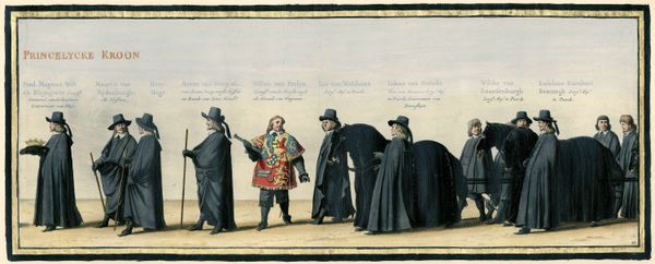 Pieter Nolpe's etching, "The Funeral Procession of Frederik Hendrik, Plate 24," presents a stark, yet compelling, study in form and structure. Executed with meticulous line work, the procession is dominated by figures uniformly cloaked in black, offering a somber palette against the muted background. The composition draws the eye across a horizontal plane, emphasizing the repetitive, almost regimented, nature of the figures. Each is delineated with precision, yet unified, creating a visual rhythm. Nolpe disrupts any sense of celebratory grandeur, instead focusing on the inherent structure of the collective. The black attire reduces each figure to a study in shape and outline, destabilizing notions of individual prominence. The uniformity of attire challenges established hierarchies, prompting reflection on the leveling effect of death. The print thus functions not merely as a record, but as a complex interplay of form and symbolic representation.
