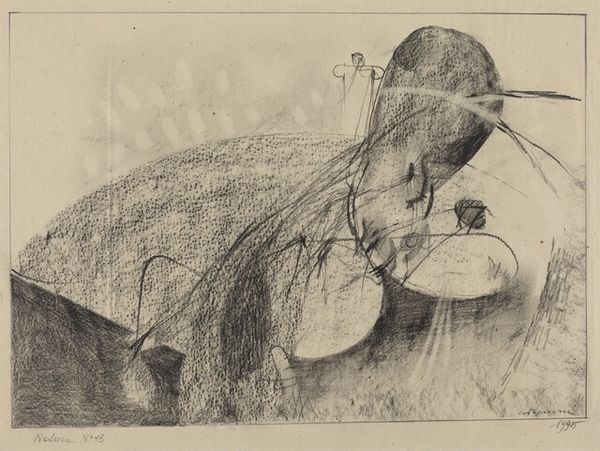 Alfred Krupa created this artwork, Grated Ink: Horses, in 1955, using an unidentifiable medium. The stark contrast of black and white immediately captures our attention, presenting a scene of labor with a team of horses. The image is defined by its method: a subtractive process where light is scratched out of darkness. This use of line is not merely descriptive, but performative, creating texture and depth. The scratched lines form the horses and agricultural tools with an intensity that suggests movement and effort. This grating technique seems to question traditional artistic values, where creation often involves building up rather than stripping away. It challenges our perception by revealing form through absence, suggesting a world seen through a glass darkly. The image's aesthetic is inseparable from its technique. Notice how Krupa uses the scraping of the ink to imply not just form but also a certain gritty reality. It's a statement about how art can emerge from and interact with the material world in unexpected ways, inviting continuous viewing and interpretation.