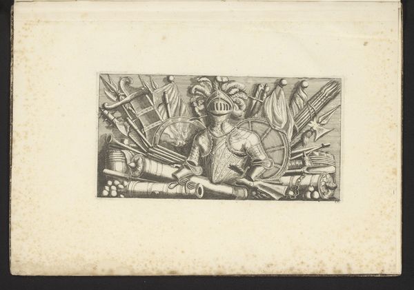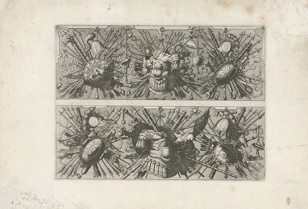 These prints by Johannes or Lucas van Doetechum present two vertical trophies with armaments. Shields, spears, and full suits of armor are arranged in a decorative display, evoking classical Roman triumphs. The motif of arms as trophies has a lineage stretching back to antiquity. Think of the sculpted arms adorning triumphal arches. Here, the meticulous arrangement transcends mere militarism. These symbols of war are transformed into emblems of victory, order, and the spoils of conquest, reflecting a deep-seated human impulse to memorialize dominance and power. Consider how these arrangements resonate with earlier traditions – even the simple act of heaping stones to mark a victory. The collective memory of triumph is powerful and enduring, engaging viewers on a subconscious level, stirring feelings of awe and respect for the victors. Thus, the trophy of arms is not merely a display of weapons, but a complex symbol of cyclical resurgence, evolving through time, and echoing through various cultural expressions.