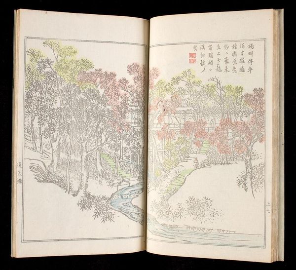 Curator: This delicate book, “Book of Paintings by Kimpaen (Kimpaen gafu),” comes to us from the hand of Kawamura Bunpō, an artist active in the late 18th and early 19th centuries. The Harvard Art Museums hold this particular copy. Editor: It’s interesting, it feels so quiet. The colors are muted, almost faded, giving a sense of ephemeral beauty. The composition, spread across the two pages, invites contemplation. Curator: Bunpō was known for his attention to detail and his ability to capture the essence of nature. His work often reflected the prevailing aesthetic values of his time. Editor: I’m curious about the symbolism. The blossoms, of course, are a classic motif, but their placement, the almost symmetrical mirroring across the book's spine, suggests a deeper meaning. Curator: The pomegranate-like flowers could represent fertility and abundance, common symbols in Japanese art. The book itself, as a curated collection, presents an ordered view of the world. Editor: A fascinating point. So much meaning embedded in something so outwardly simple and elegant. Curator: Indeed, a small book, a large story.