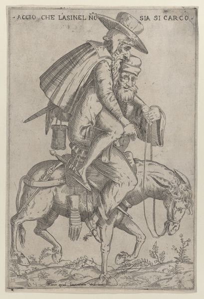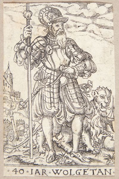 Editor: We are looking at the "Standaarddrager," a print by Monogrammist AC, created sometime between 1520 and 1562. I’m struck by how detailed the textures are in this engraving—the fur trim, the woven pattern on the armor. How do you interpret the labor and materials that go into a piece like this? Curator: What I find fascinating is the act of replication itself. An engraving facilitates the mass production and dissemination of images, wasn’t simply about aesthetics. It allowed for a wider consumption of imagery, impacting social values, beliefs, and even fashion. Editor: So, you’re saying the *process* of printmaking, in itself, is deeply relevant? More than just the image? Curator: Absolutely! The artist’s skill lies not only in depicting the "Standaarddrager," but in mastering the craft of engraving to make him reproducible. And look at the detail afforded to clothing: What materials would have been used in his actual clothes? Think of who might have been able to afford such a high-ranking soldier uniform. Where was it made, and how were those clothes themselves distributed? Editor: That's such a fascinating perspective – it recontextualizes the subject matter and allows the viewer to think more critically about society, in its time, from production, manufacture, consumption. I hadn't thought about the engraving itself as a tool of dissemination. Curator: It shifts the focus from pure aesthetics to a deeper understanding of artistic creation as a form of labor, deeply embedded within a specific socio-economic framework. Thinking about how different social classes and cultural factors relate to art shifts our understanding, wouldn’t you agree? Editor: I totally agree. It’s so helpful to think beyond just the surface of the image. I learned so much about viewing art as an extension of human experience!