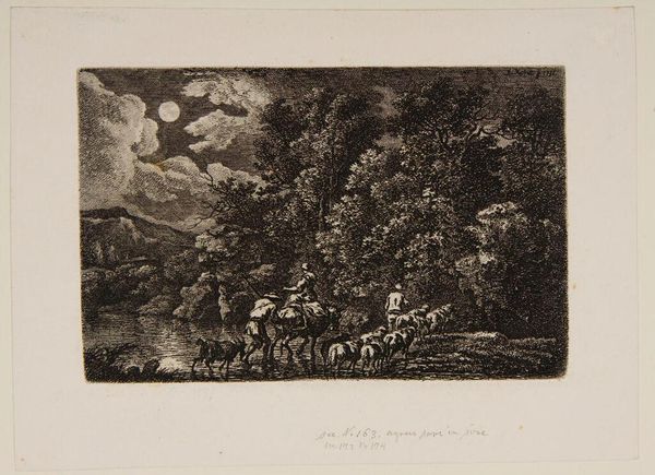 Curator: This is "Dido and Aeneas," figures engraved by Francesco Bartolozzi, housed here at the Harvard Art Museums. Editor: It feels like a stage set, a tempestuous scene frozen mid-performance. Curator: Indeed. Bartolozzi masterfully uses light and shadow, creating a binary opposition between the idyllic landscape and the dramatic embrace, evoking a sense of impending doom. The composition draws the eye to the couple, set against the backdrop of nature. Editor: There's an emotional rawness in the way their figures are rendered. The looming darkness definitely amplifies the tragic love story. I get a sense of longing mixed with desperation. Curator: Precisely. The engraving technique adds a layer of complexity. The contrast is stark, highlighting the preordained tragedy embedded in the narrative. Editor: It's funny, even knowing the story, seeing it framed this way, it stings anew. Curator: Well, there we have it. Editor: Quite.