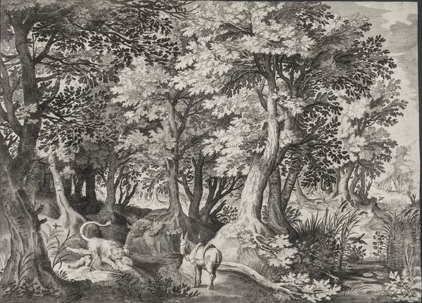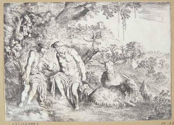 Curator: We are looking at "Nymphs in a Landscape," an engraving produced by Gerhard Janssen around 1716-1717. Art Historian: My first thought is how artificial the scene feels, almost like a stage set. Look at the arrangement of the figures and the somewhat forced perspective of the landscape; it's all quite deliberate. Curator: Yes, the composition certainly guides our eye through distinct spatial zones. The foreground features the reclining figures, and the background is punctuated by the shepherd and his flock. This layering creates a carefully constructed Arcadia. The tonal range in the print contributes greatly to this reading. Notice how areas of denser engraving establish form while sparser lines articulate space. Art Historian: That artifice speaks volumes about the period's obsession with recreating idyllic, pastoral fantasies for a sophisticated urban audience. These landscapes were in high demand amongst a specific sector of society. We must ask who commissioned them and for what purposes. The art market was thriving, so artworks such as these played a role in solidifying a certain kind of aspirational identity among their wealthy consumers. Curator: Intriguing to think about this interplay between art and aspirational social standing. On a technical note, I appreciate how Janssen utilized the engraving medium. His meticulous detail allows him to portray both delicate foliage and textured fabrics, demonstrating mastery over his materials. Art Historian: I find the relative lack of overt classical symbols quite interesting. This choice arguably shifts the emphasis from mythology to a more secularized vision of nature, one that aligns well with burgeoning Enlightenment ideas about human control over the natural world. Although, I still ponder its role beyond the realm of aesthetics and into societal values of the time. Curator: This tension underscores the inherent dynamism in visual representation. A fruitful reminder of art's enduring complexity, wouldn't you say? Art Historian: Indeed, something that invites us to critically examine both the creation and its function within its contemporary society.