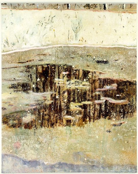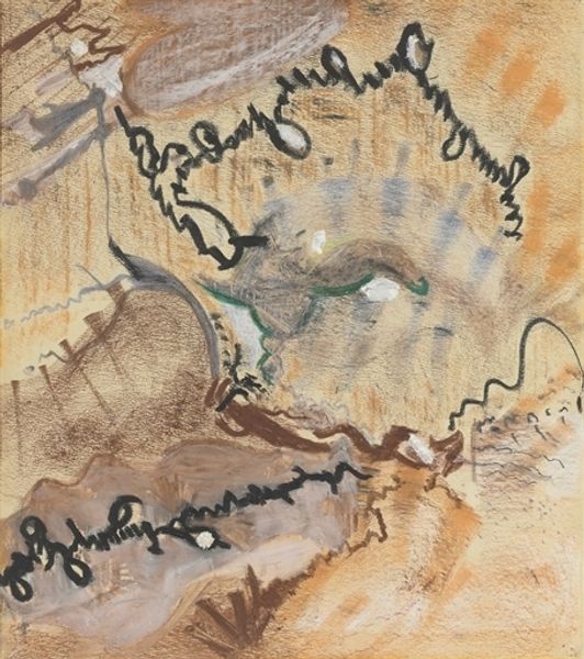 Editor: So, this is Fred Williams' "Dry Creek Bed, Werribee Gorge I." The way he's used such a muted palette gives me this immediate sense of a really harsh, almost desolate landscape. What strikes you most when you look at this piece? Curator: It feels like memory itself, doesn't it? Ghostly impressions of the Australian outback. Notice how he's not trying to replicate reality. Instead, it is all about the feeling of the place. It's almost meditative. Do you get a sense of that too? Editor: Absolutely. It's interesting how he suggests so much with so little—just a few lines, some splatters. It's like he’s distilling the essence of the gorge. Curator: Exactly! That's the magic, isn't it? It's not just a landscape, it's an experience. Editor: It really makes you think about how much an artist can convey with abstraction. Curator: And how much our own minds fill in the gaps, completing the picture, if you will.