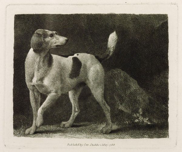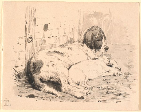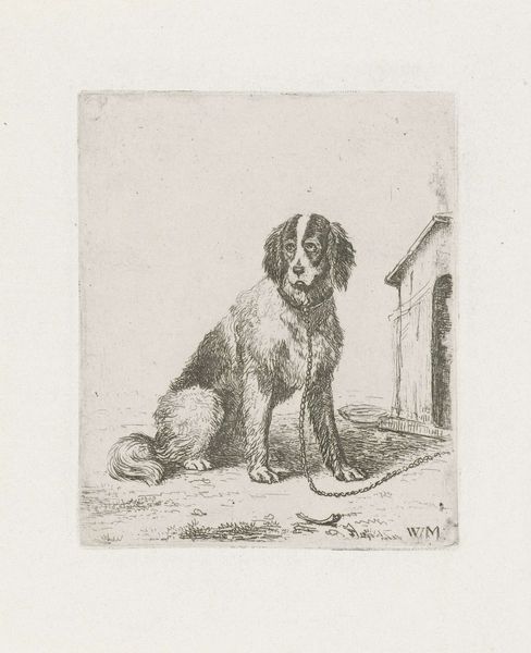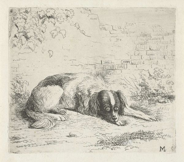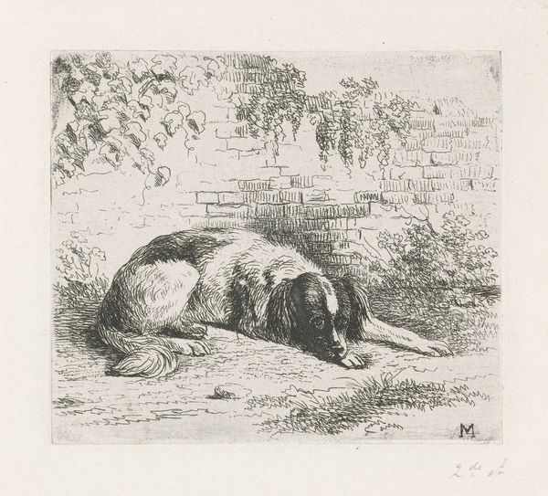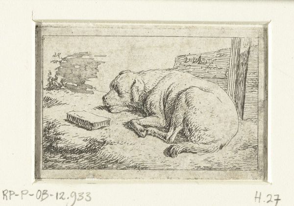This is an etching of a sleeping dog by Johannes van Cuylenburgh, made in the early 19th century. The tranquil scene is defined by gentle lines and a subdued tonal range. The composition draws our eye directly to the curled form of the dog, which occupies the majority of the image. Cuylenburgh's lines capture the soft curves of the dog's body, emphasizing its peaceful repose. The background, sketched with looser strokes, features a rudimentary wooden structure, suggesting the dog is resting in a sheltered area. Consider the subtle contrast in textures. The smooth fur of the dog is rendered with delicate lines, while the rough wood behind is depicted through denser, more varied strokes. This contrast enriches the visual experience, inviting closer inspection. Note how the lack of vibrant color directs our focus to form and texture. Ultimately, the artwork functions as an investigation into the potential of line and form to evoke a sense of calm and contentment. Cuylenburgh's ability to create depth and texture through simple etching techniques invites a deeper contemplation of the intimate relationship between humans and animals.