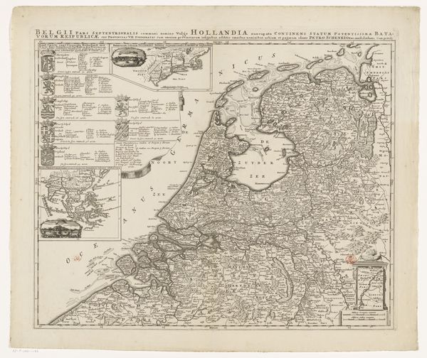 Editor: We're looking at a piece titled "Kaart van het graafschap Vlaanderen, met een gezicht op Gent," a map of the County of Flanders with a view of Ghent. It was created between 1617 and 1622 by an anonymous artist and the medium is engraving. It's incredibly detailed, almost overwhelmingly so at first glance. What structural elements stand out to you in this composition? Curator: Indeed, the sheer density of visual information demands close scrutiny. Observe how the composition is rigidly structured. The prominent, framed map is dominant, while subsidiary imagery – figures and city view – occupy distinctly separate registers. Notice also the strategic placement of cartouches. Consider how such compositional devices contribute to the artwork’s semiotic function as both descriptive geography and emblem of political authority. Editor: Political authority? Curator: Absolutely. Note how the sharp, clean lines of the engraving lend an air of precision and control, reinforcing a sense of dominion over the depicted territory. Consider how the Baroque style informs not just aesthetic choices but also communicates power dynamics through form itself. Is that not telling? Editor: It is! I see now how the strict organization reflects a desire to impose order, both literally on the landscape and symbolically through artistic representation. Curator: Precisely. By deconstructing its visual components, we can understand this map as more than just geographical data; it’s a powerful statement about control and knowledge. Editor: That's fascinating. I initially saw it as just a historical document, but looking at its structure reveals so much more about its purpose. Thank you for that perspective. Curator: It is through such formal dissections that the essence of any artistic endeavor can be accessed, would you not agree?